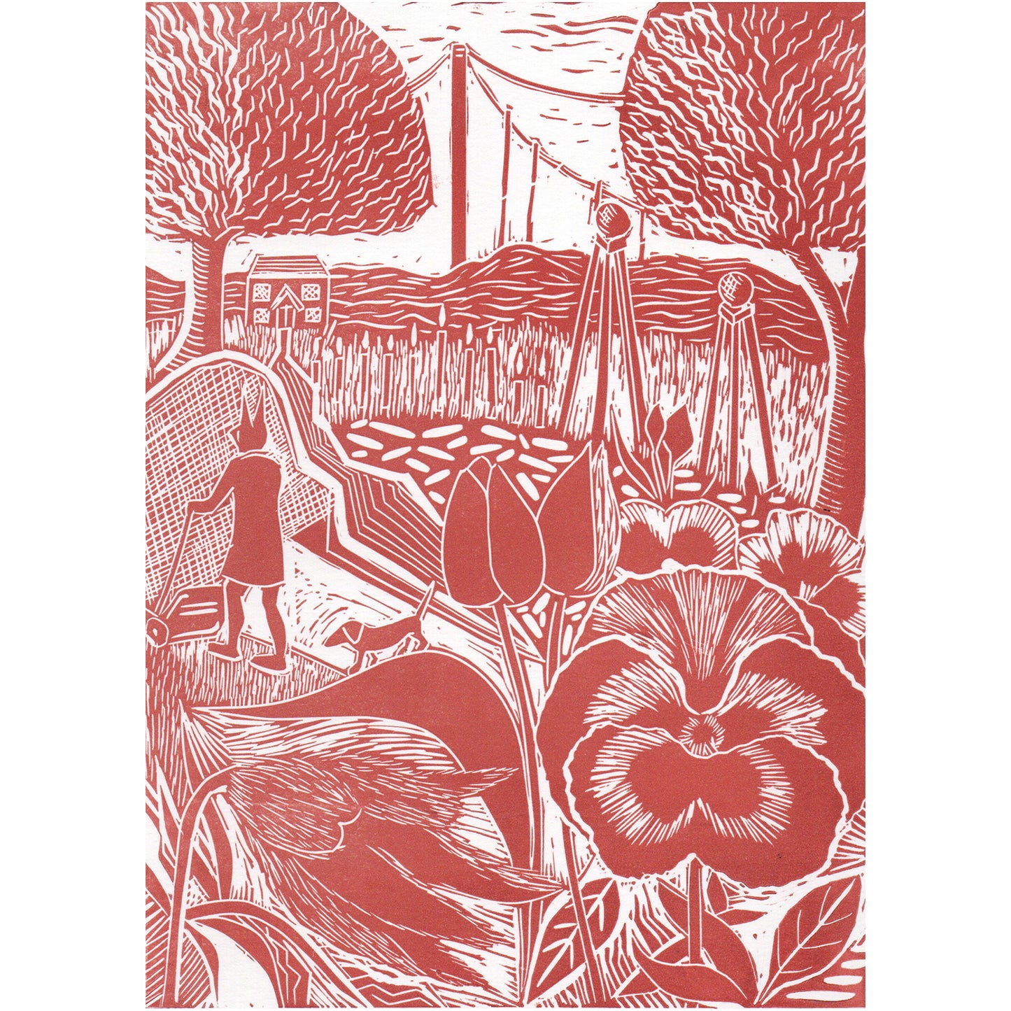 At the start of 2021 I decided that I would like to document my life (and Marple's!) here at Holly Tree Cottage through a series of monthly linocuts. This is April .In April, I bought myself a new lawn mower which has changed my life ( I'm not joking!) so I spent a lot of time mowing the lawn whilst trying to stop Marple from attacking the mower. The tulips were coming out, I was still enjoying the pansies in my pots and also admiring the furry pulsatilla growing outside my back door.