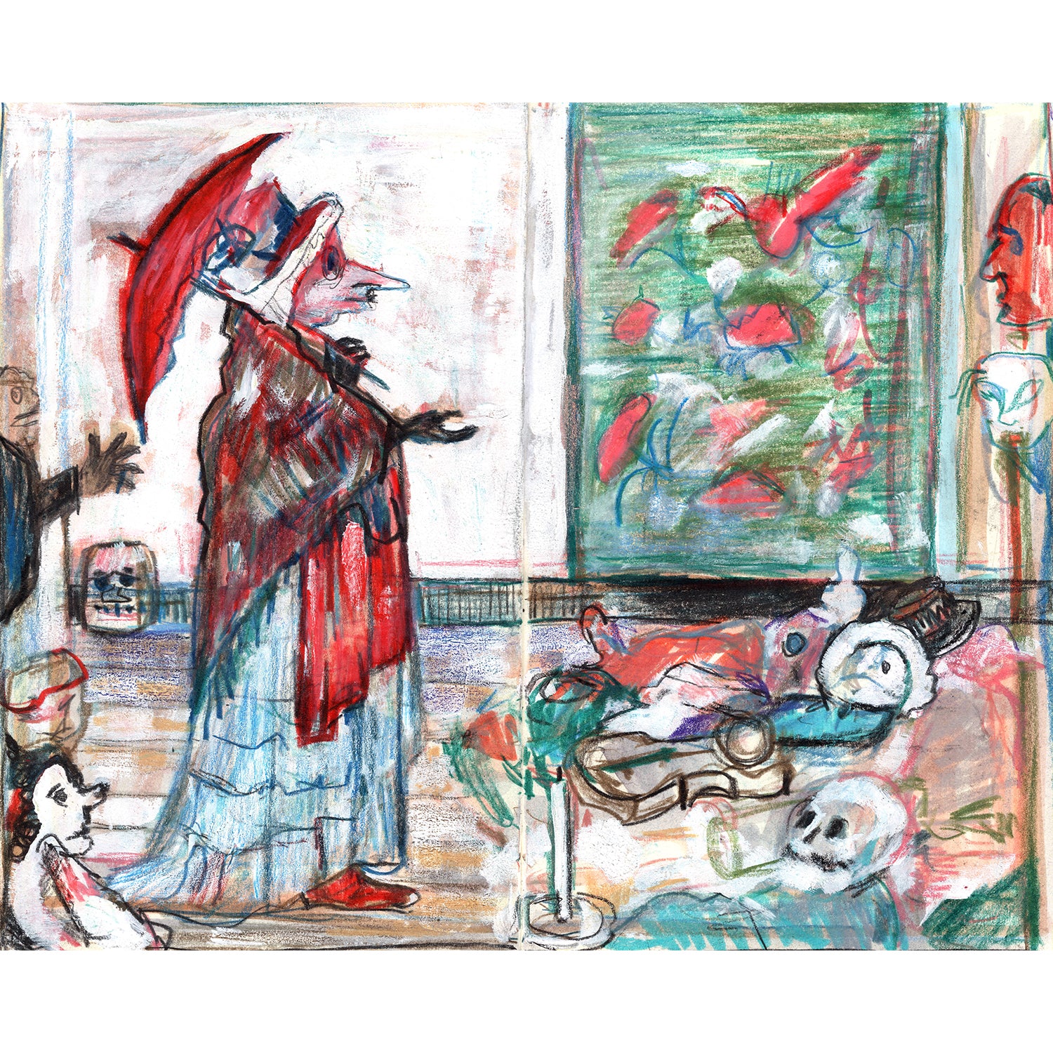 In 1889, James Ensor painted The Astonishment of the Mask Wouse, one of the top works of the Ostend Master, which has been in the possession of the Royal Museum of Fine Arts Antwerp since 1926. The work presents a masked, dolled-up old woman in an enchanted room. She is portrayed at full-length and in profile.