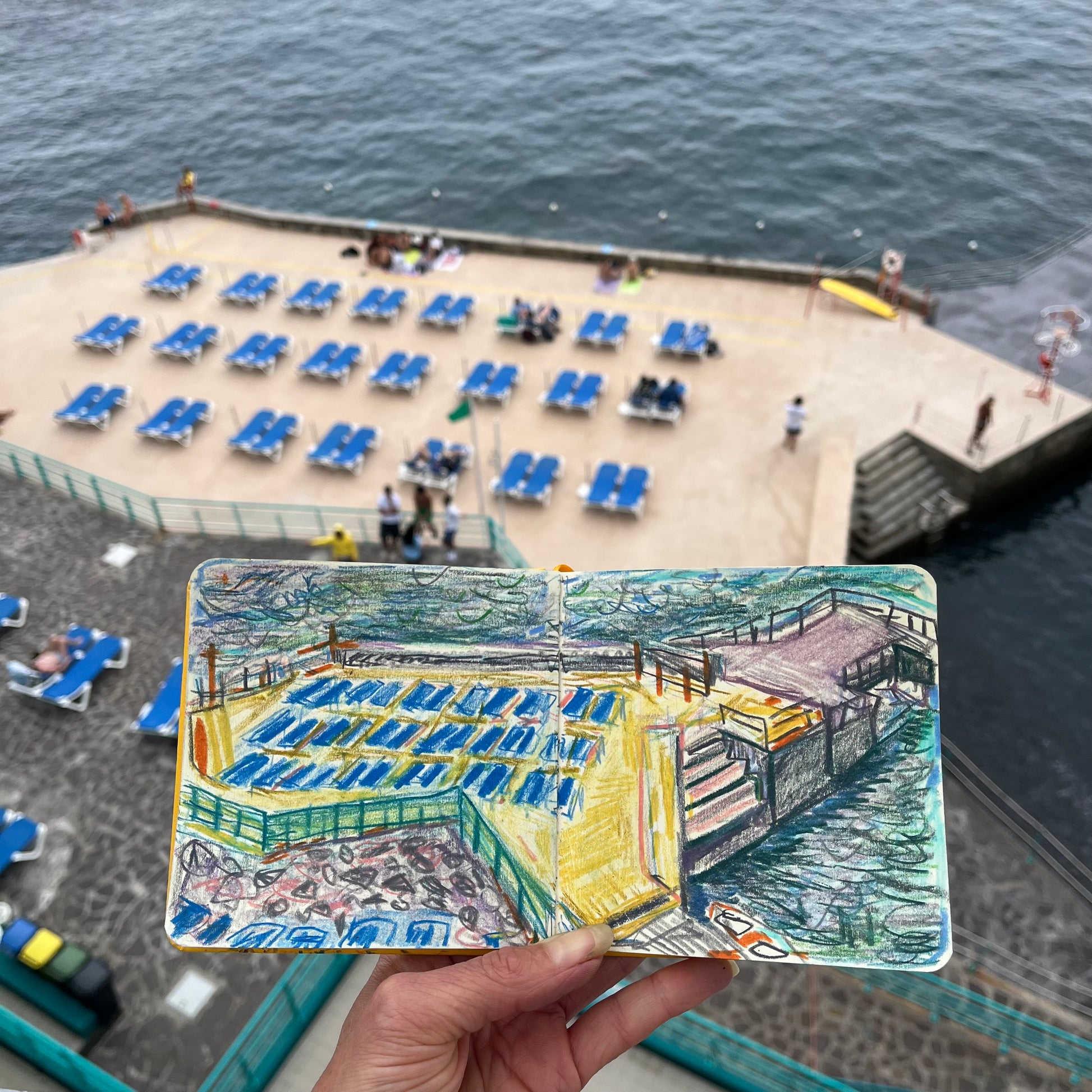 Barreirinha beach is located at the far end of Funchal town , it's popular with locals who visit there to cool off after a day's work. I really enjoyed spending time there, sunbathing on the beds , having a dip in the sea and of course drawing!