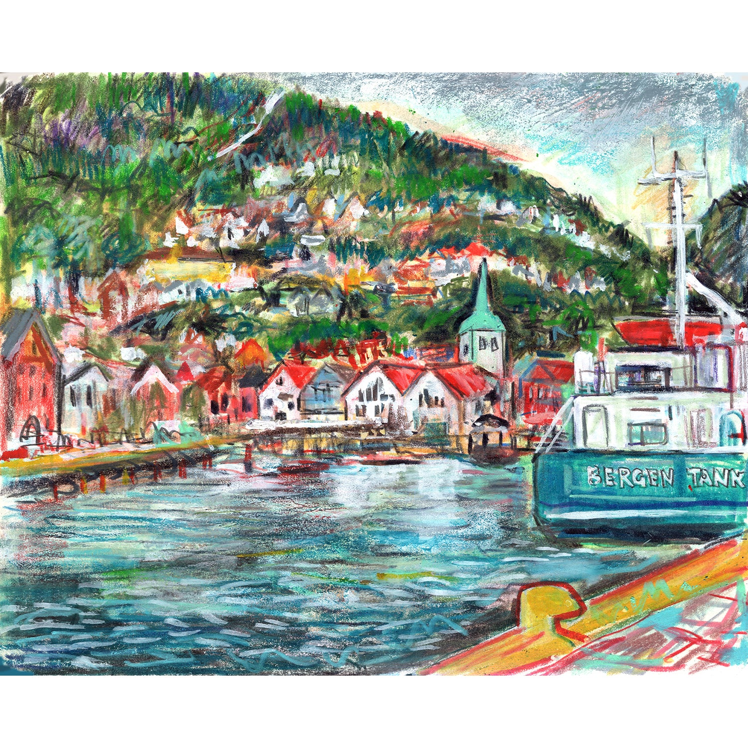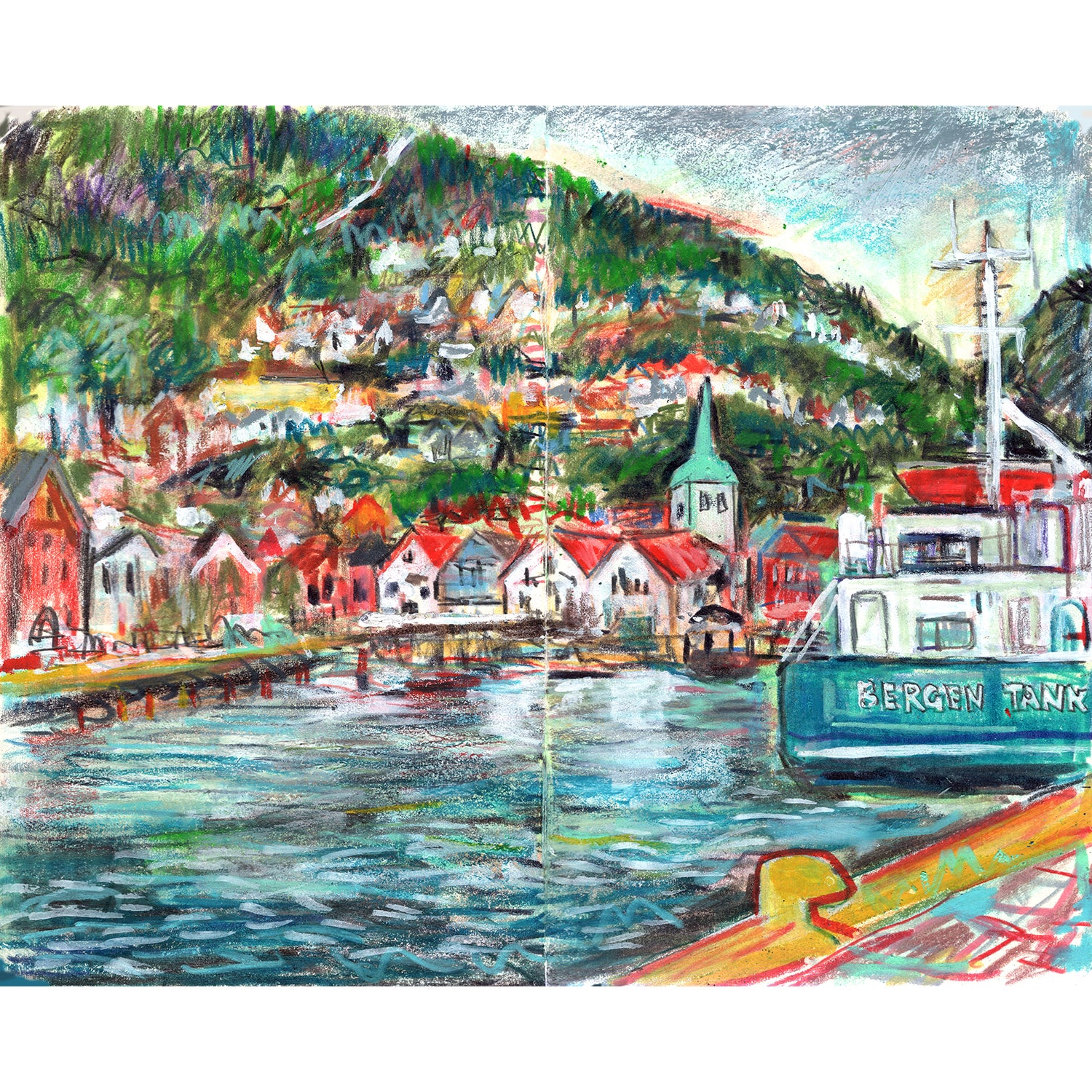 I loved this view of the wharf , with the boats and Mount Fløyen in the background that I drew it twice, using rough lines to capture the dark foliage and shrubbery of the mountainside. This is the second drawing of the two. You can see the Fløibanen is a funicular railway.