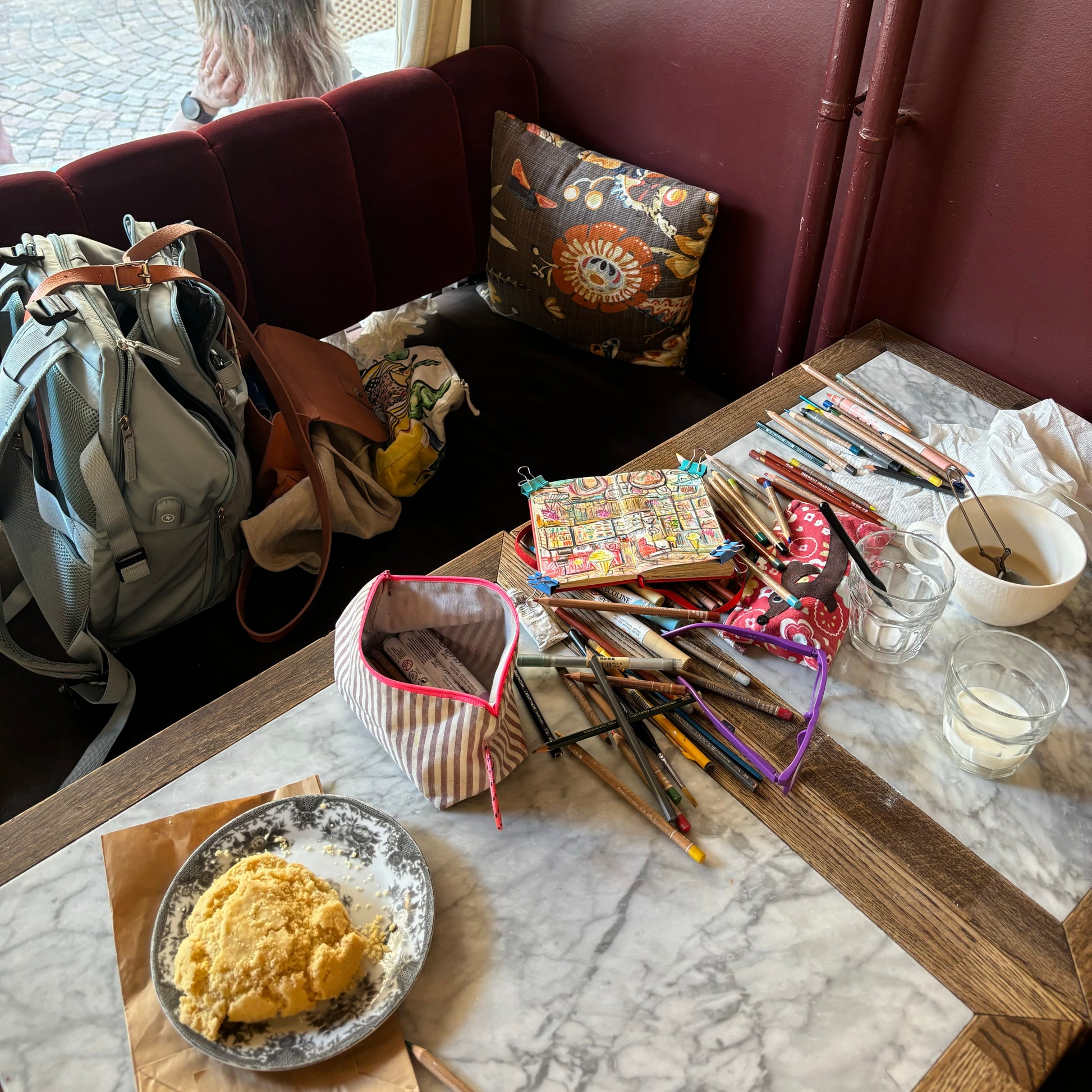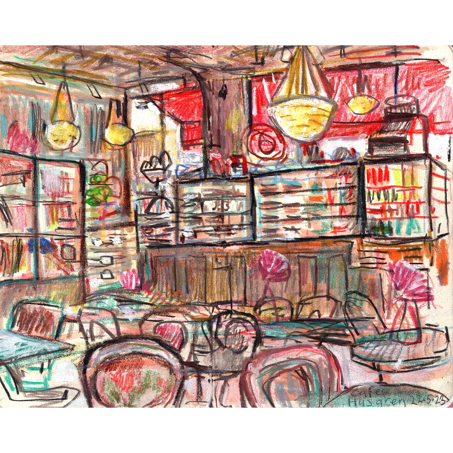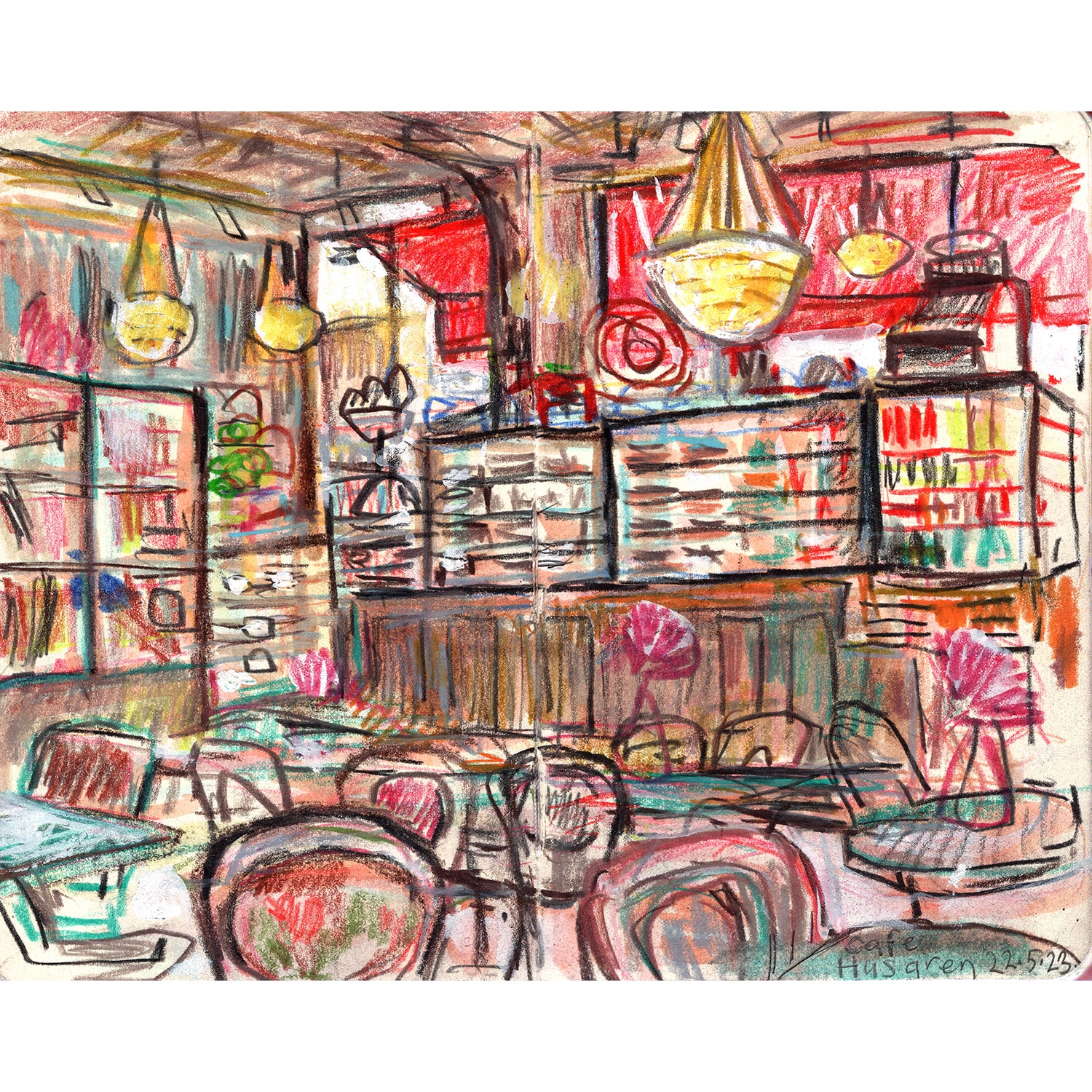 Cafe Husaren is one of Gothenburg's most loved cafes. The cafe is housed in a beautiful, listed building in the old area of Haga. It's home of the giant hagabullen , which is a giant cinnamon bun. The interior of the cafe is charming, and I spent a lovely afternoon, slowly making my way through my bun, drinking coffee and doing this drawing.