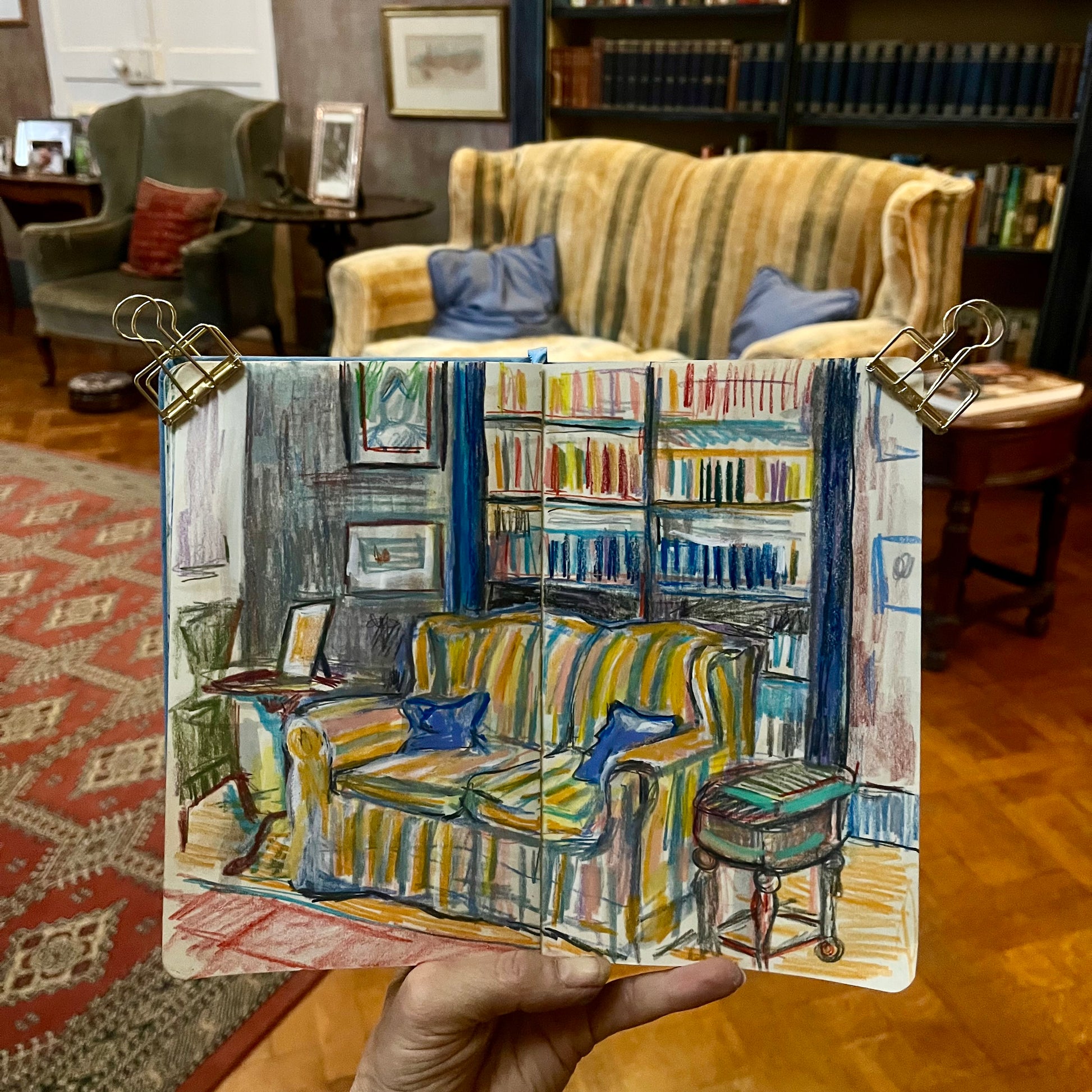 Casa Rocca Piccola is a historic Palace in the heart of Valletta - it was built in the 16th century and is now the the ancestral home of the 9th Marquis de Piro. It's open to the public but also has private rooms where you can stay. I spent a wonderful week there and really enjoyed drawing the eccentric rooms in the Palace. This is the Library - the well worn sofa was a delight to draw.