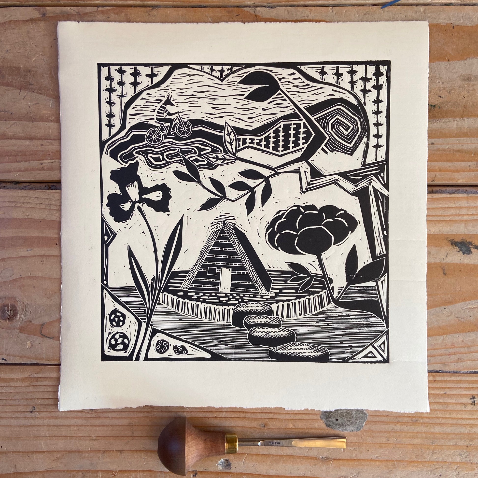 I print everything from my studio using a small wooden hand press and my etching press. The finished result is unique and original with no two prints being alike.