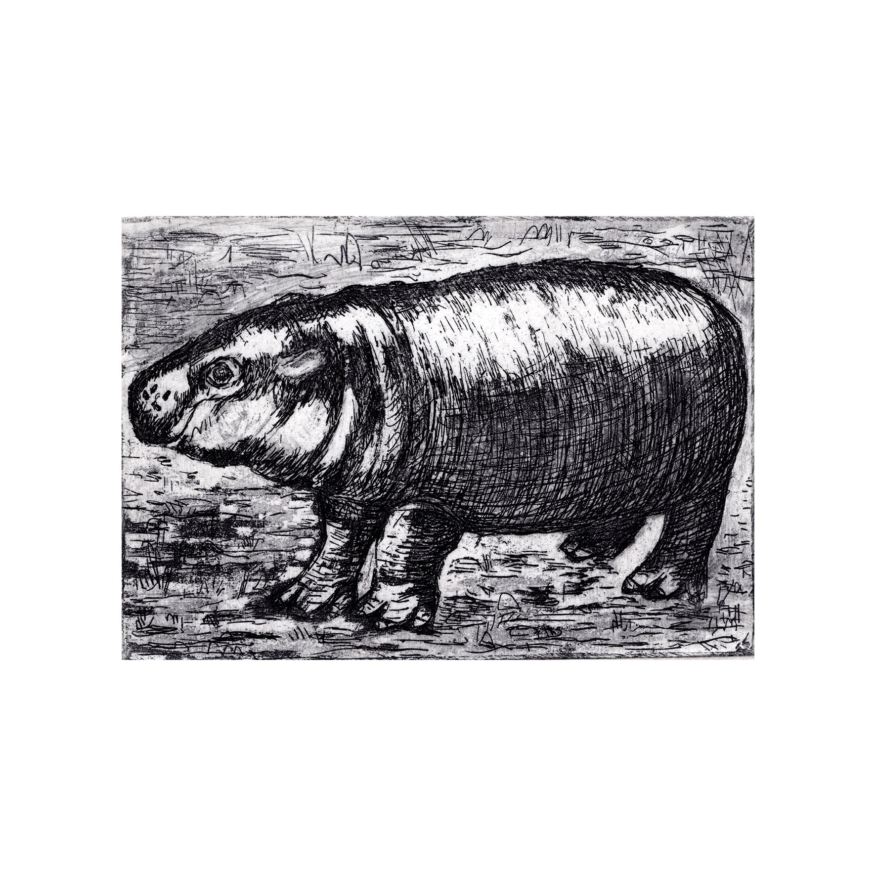 This etching was inspired by Moo Deng who became a sensation after her birth at Khao Kheow Open Zoo in Thailand in July 2024. Her name- meaning “bouncy pork” in Thai - was chosen by over 20,000 adoring fans ( It's a slightly odd name but let's go with it !) I fell in love with her sweet face and playful spirit and knew I had to turn her into an etching