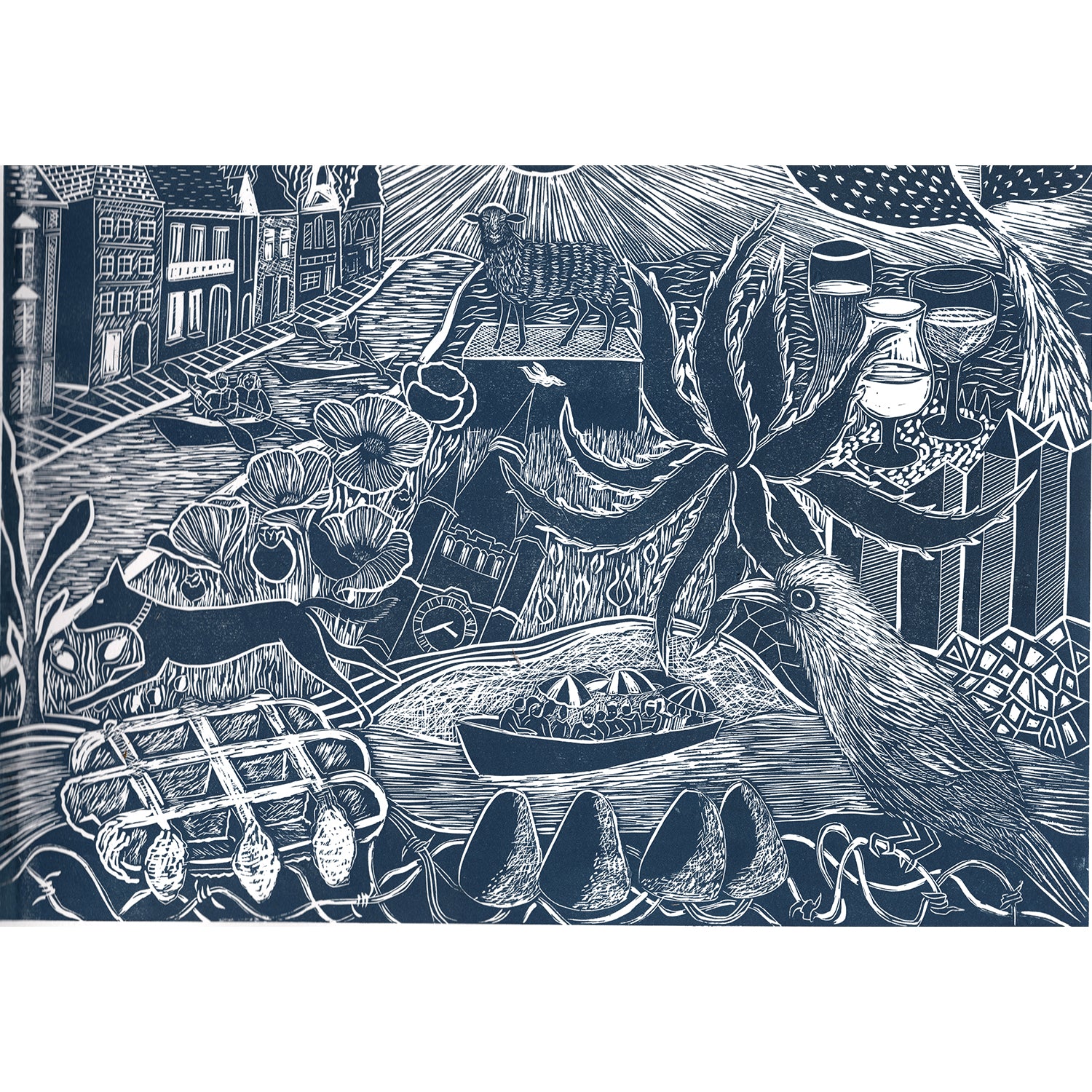 I've been to Ghent a few times now, and it's one of my all time favourite cities. It has such a wonderful vibrant atmosphere due to it's many students, medieval streets and magnificent museums. It's also home to the Ghent Alterpiece , also called the Adoration of the Mystic Lamb by Hubert and Jan Van Eyck. This linocut showcases many of the memorable parts of Ghent - you can see the mystic Lamb at the top of the work, the infamous Belgium beers on the right hand side , the delicious Belgian waffles in the bottom left - and a interpretation of a graffiti bird I saw on a wall in the city.