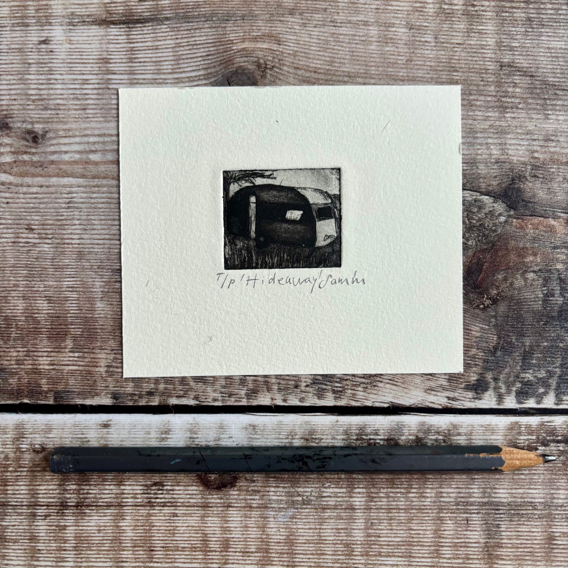 I have a couple of my tiny ‘Hideaway’ caravan etchings available.