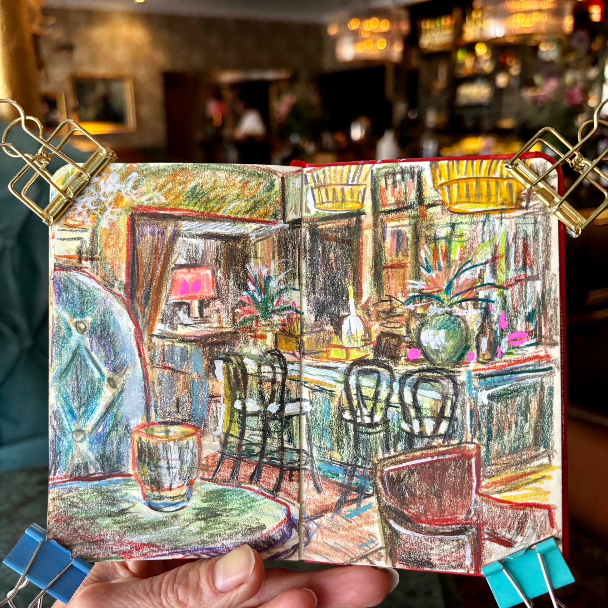 I stayed in Hotel Pigalle for a couple of nights during my recent trip to Gothenburg. It's a boutique hotel with decor inspired by the 1920's Art Deco. I loved the main bar, it was dark, velvety and very cosy. It rained on the last afternoon of my trip, so I took the opportunity to sit in the corner of the bar and do a drawing, capturing the warm ambience of the lamplight. One of my favourites of my trip.