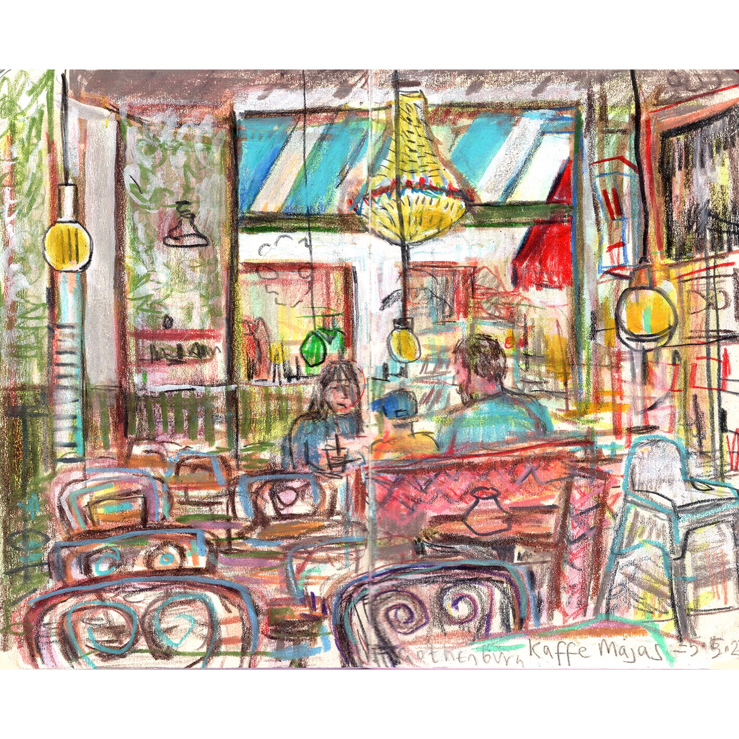 Kaffe Majas is one of my favourite cafes in Gothenburg. I visited a few times during my first trip to Gothenburg and adored the colourful interior. Therefore, it was a priority for me this time to have a coffee and a bun, and do a drawing of this bustling and inviting scene.