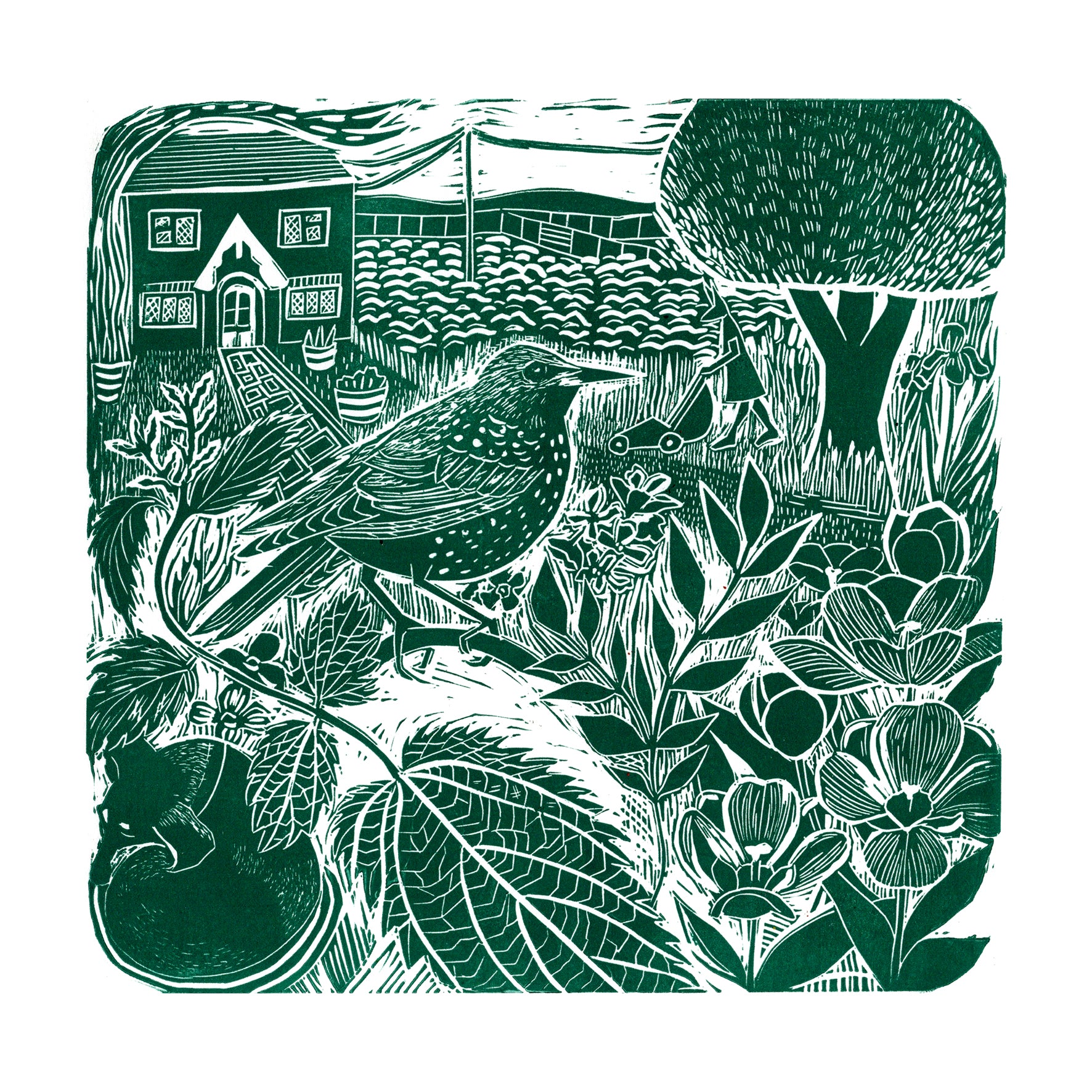 This is the 2nd print in my lockdown series and it tells the story of the second and third week when the tulips were still flowering and the nettles were starting to overtake the garden. To soothe my agitated mind I took to mowing the lawn in a frenetic way whilst also finding solace in watching the garden birds, particularly the plump starling. Marple as always took it all in her stride and snoozed her way through it all.