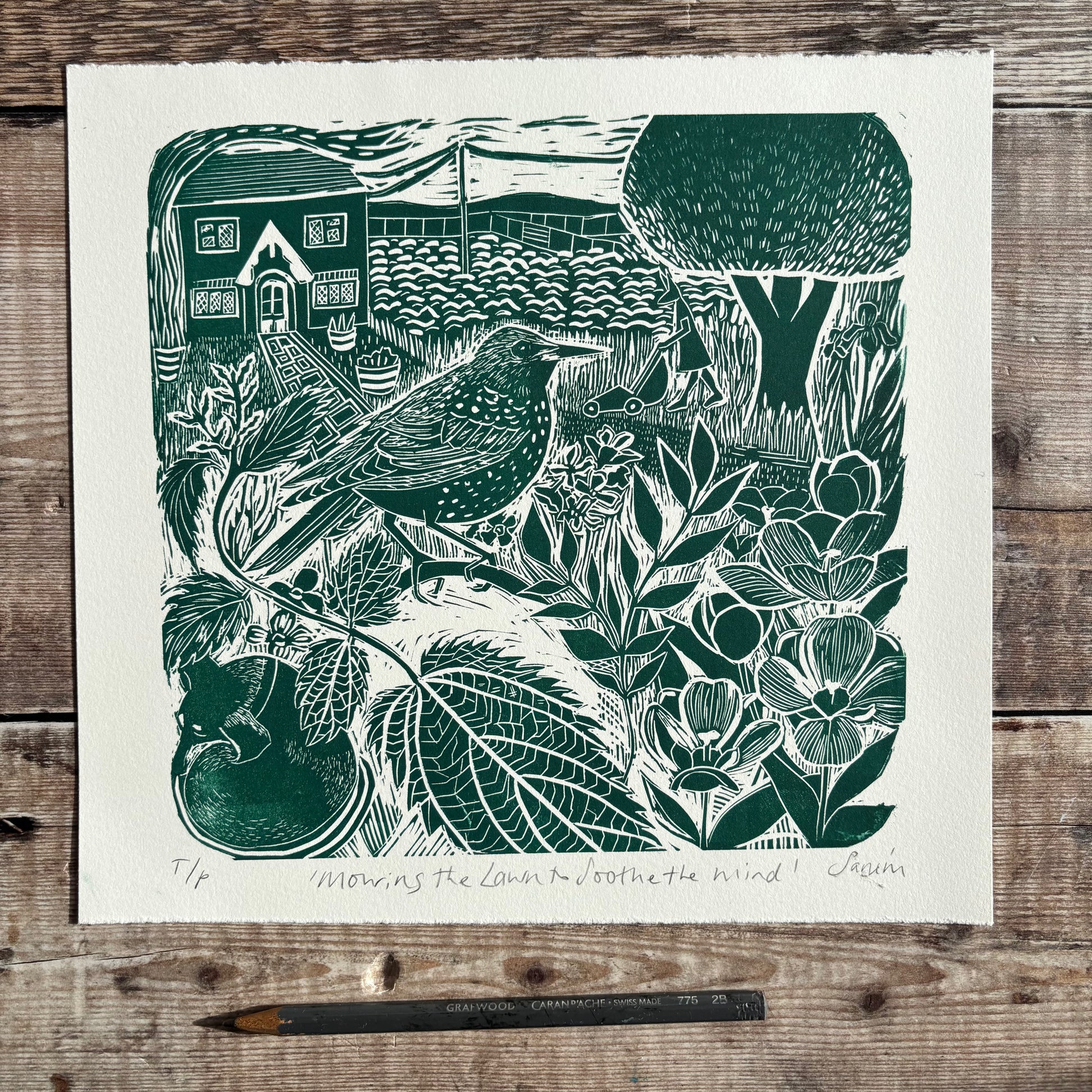 I have a couple of test prints of my ‘Mowing the Lawn to Soothe the Mind' linocut.