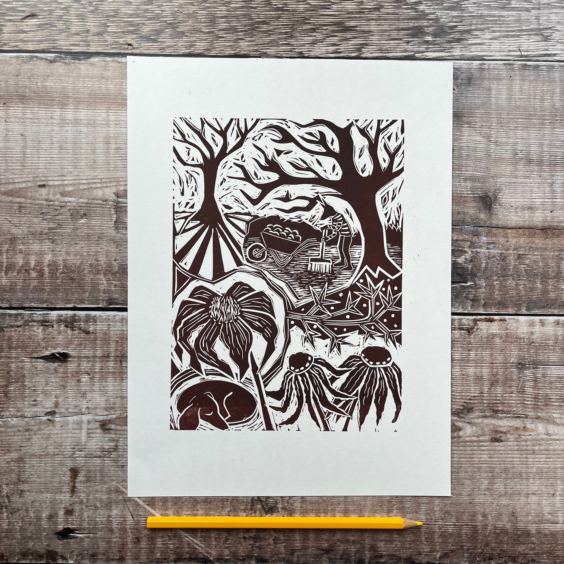 At the start of 2021 I decided that I would like to document my life (and Marple's!) here at Holly Tree Cottage through a series of monthly linocuts. This is November. In November the dahlias are fading and the echinacea are looking dramatic as they wane. I'm always busy raking the leaves whilst Marple is no help at all, and continues to snooze whilst I work.