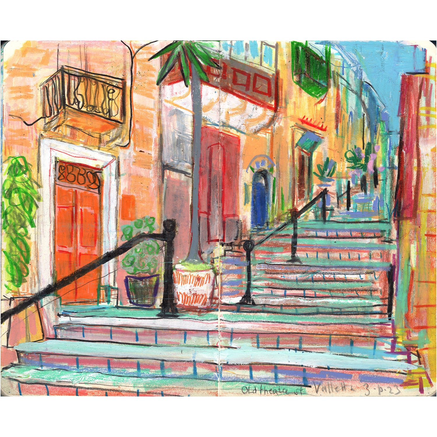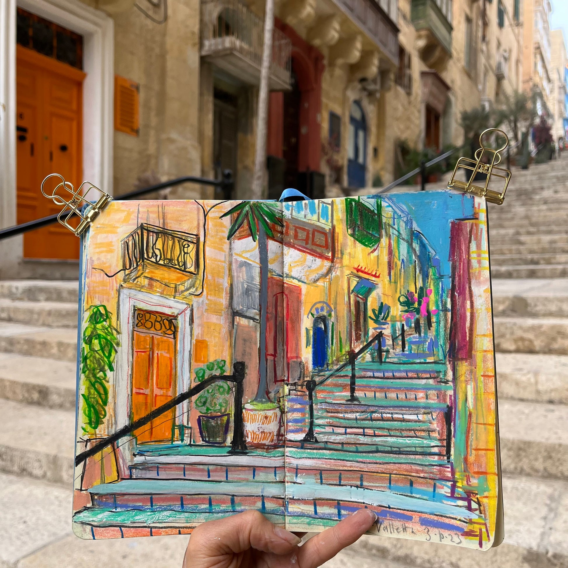 When I first arrive at my destination, I always take a walk to get to know the area and also to bookmark places to draw during my stay. This was the first street that grabbed my attention. During my stay I drew it 3 times, this is the final drawing and I've drawn it from the bottom of the street looking up. I loved the orange door and the blue sky peeking through at the top of the street.