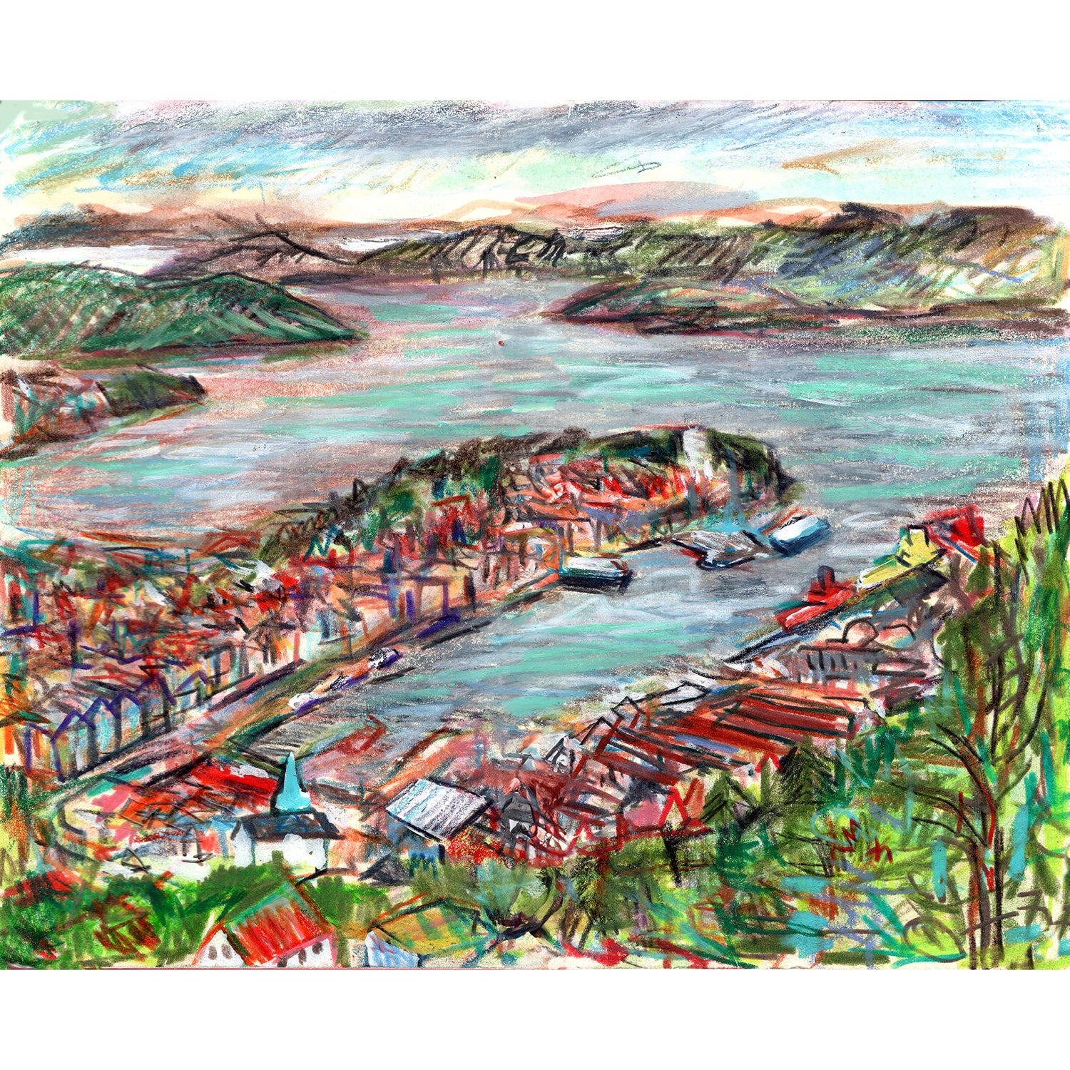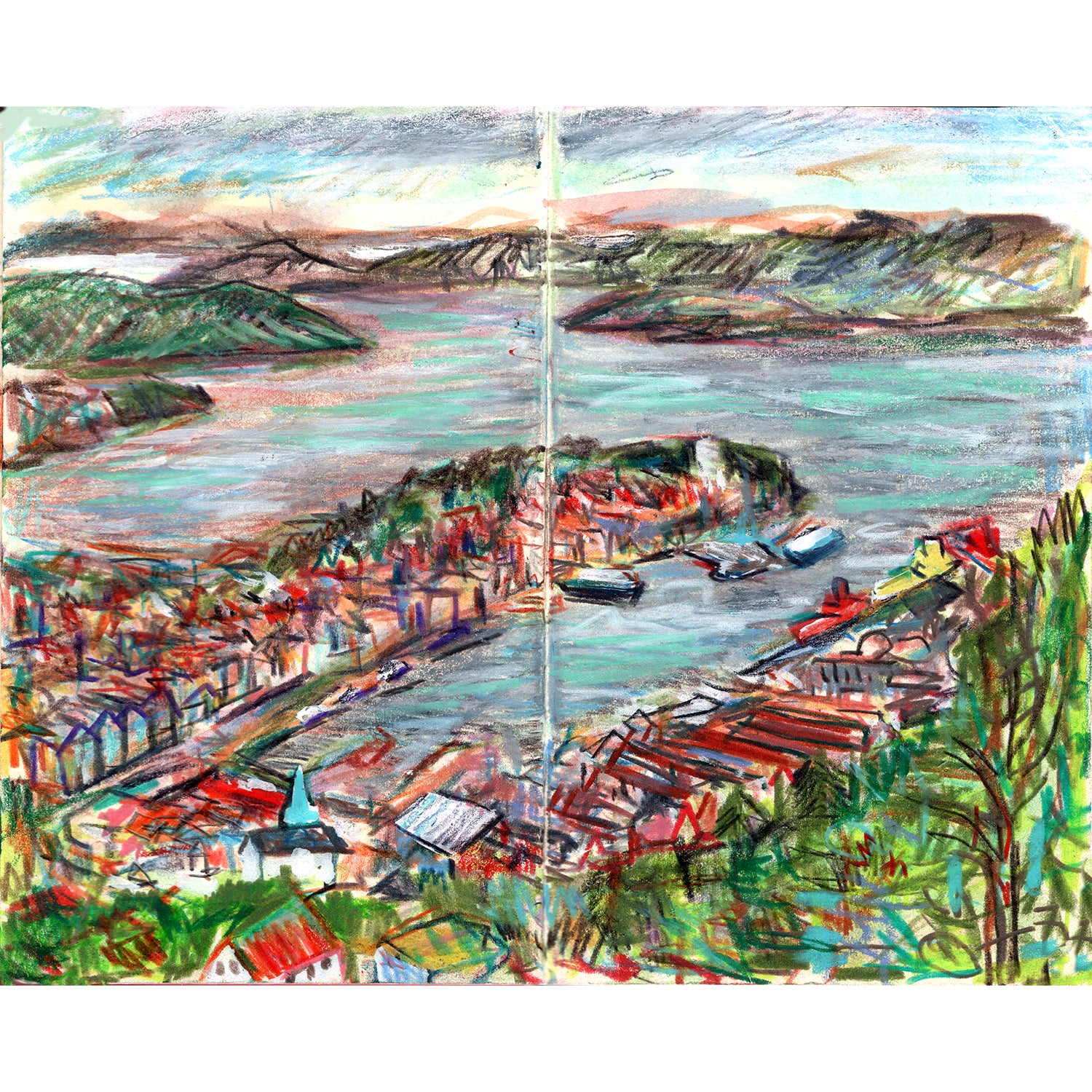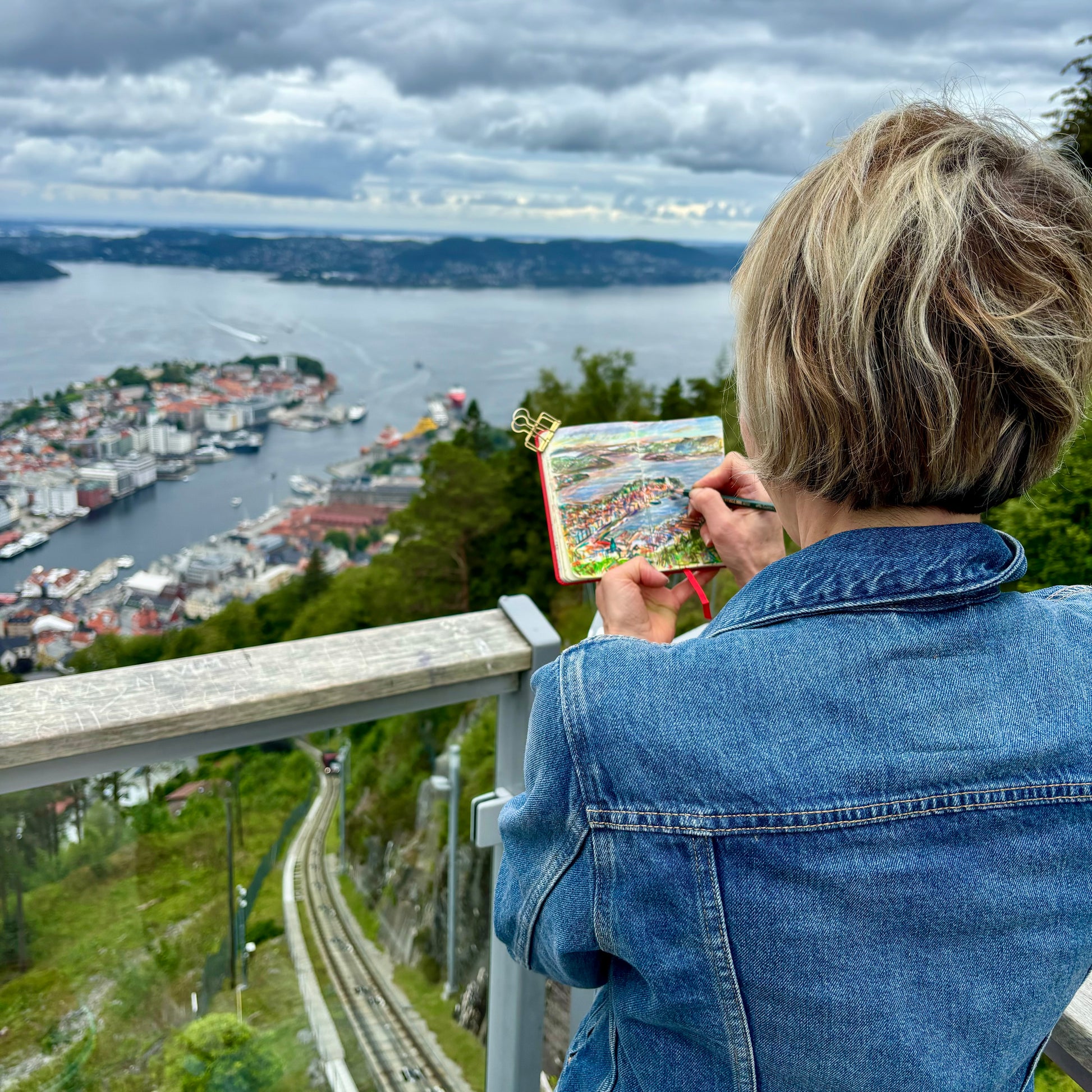 One of the first things I did when I arrived in Bergen was take the Fløibanen funicular up to the top of Mount Fløyen. The view at the top was breathtaking and I knew I had to spend some time looking and drawing. It was busy at the top, so I gathered a lot of attention - many people wanted to take my photo of me drawing and wanted to chat about my work. The drawing therefore took me longer than normal!