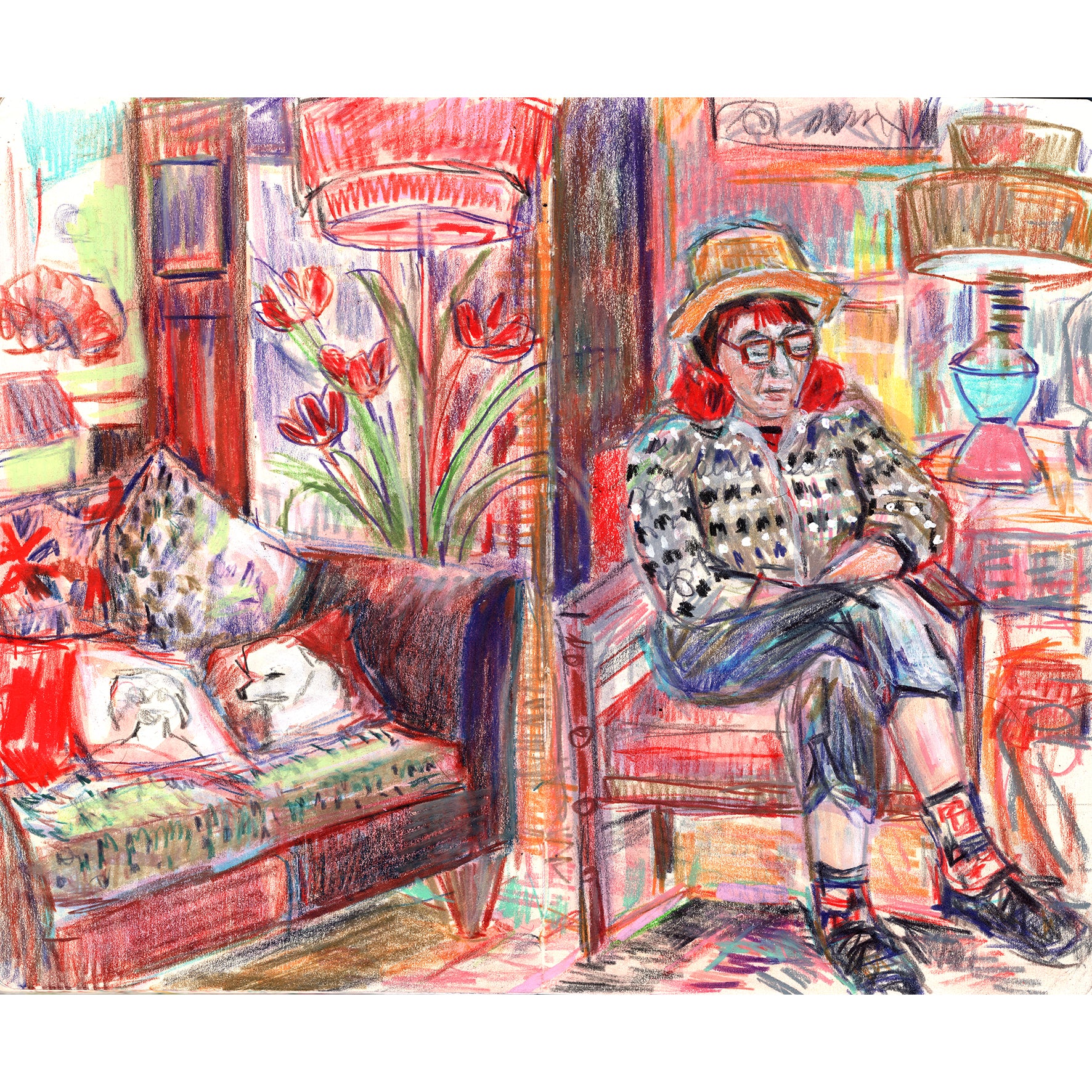 This is a drawing of my friend Phyllis in her colourful home in Santa Rosa. Her home is a treasure trove of vintage furniture, objects and books. It bursts with mementoes from her travels around the world , particularly Mexico. Phyllis is a milliner, an artist, a musician and all round inspiration. I could have spent my entire trip drawing her in her remarkable home.