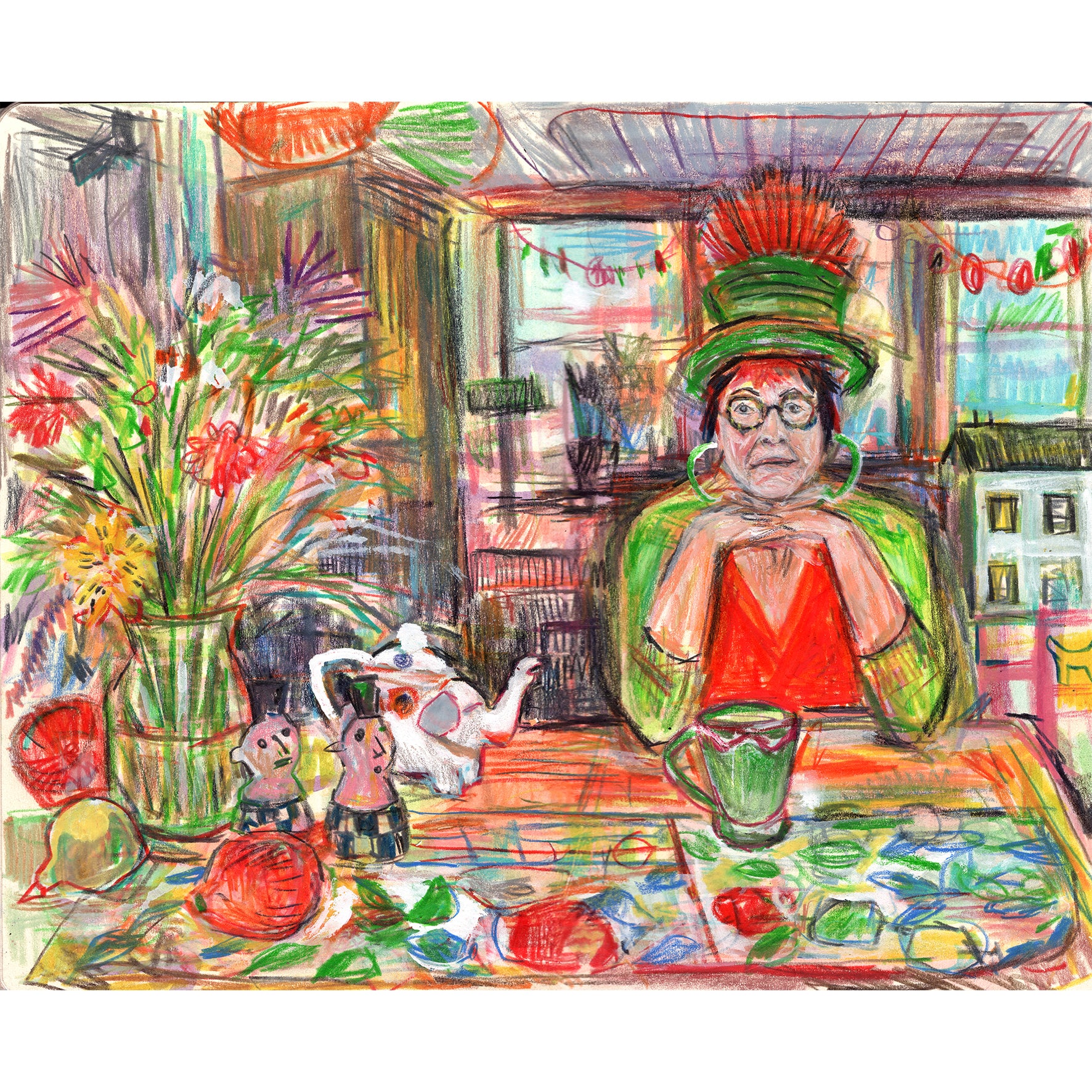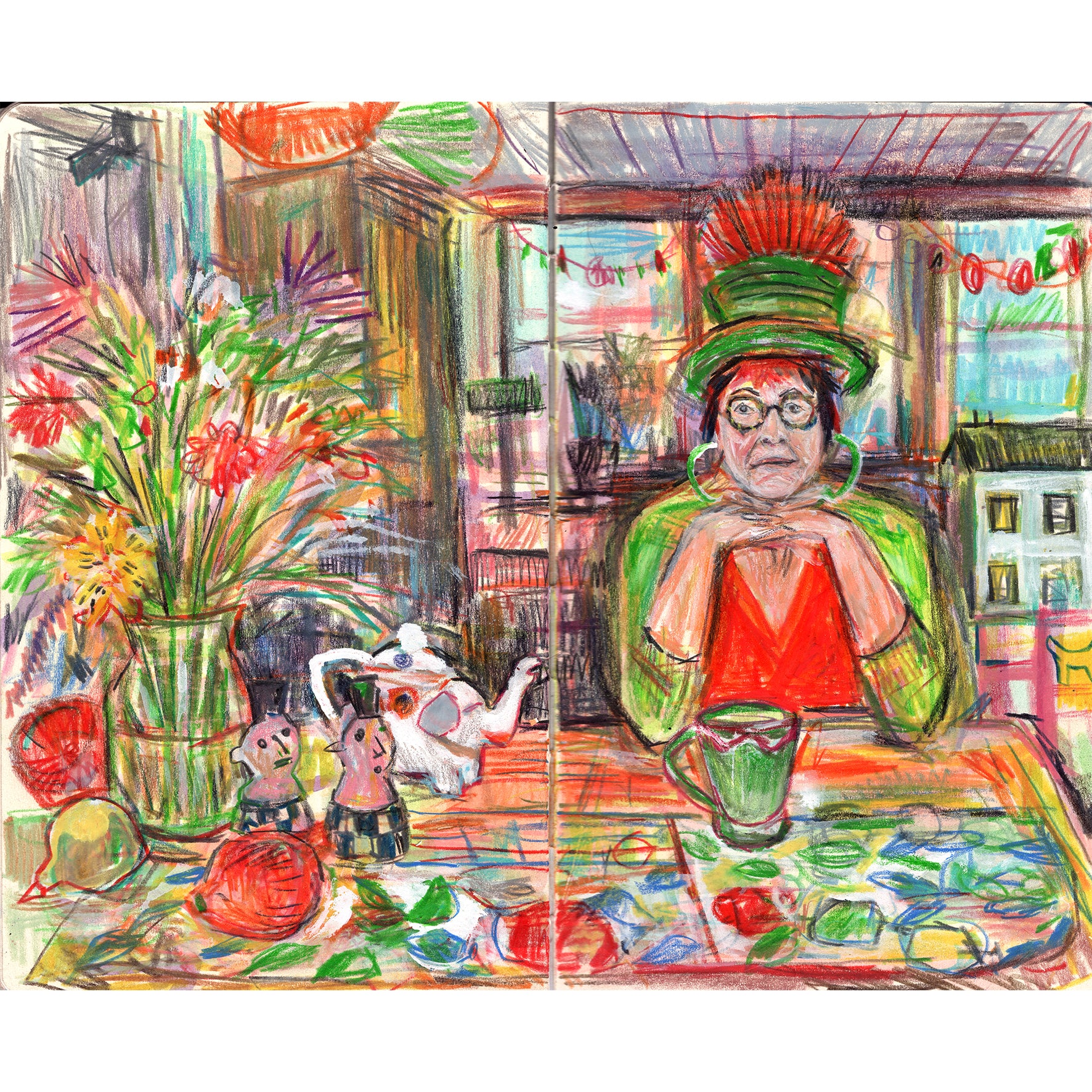 This is a drawing of my friend Phyllis in her colourful home in Santa Rosa. Her home is a treasure trove of vintage furniture, objects and books. It bursts with mementoes from her travels around the world , particularly Mexico. Phyllis is a milliner, an artist, a musician and all round inspiration. I could have spent my entire trip drawing her in her remarkable home.