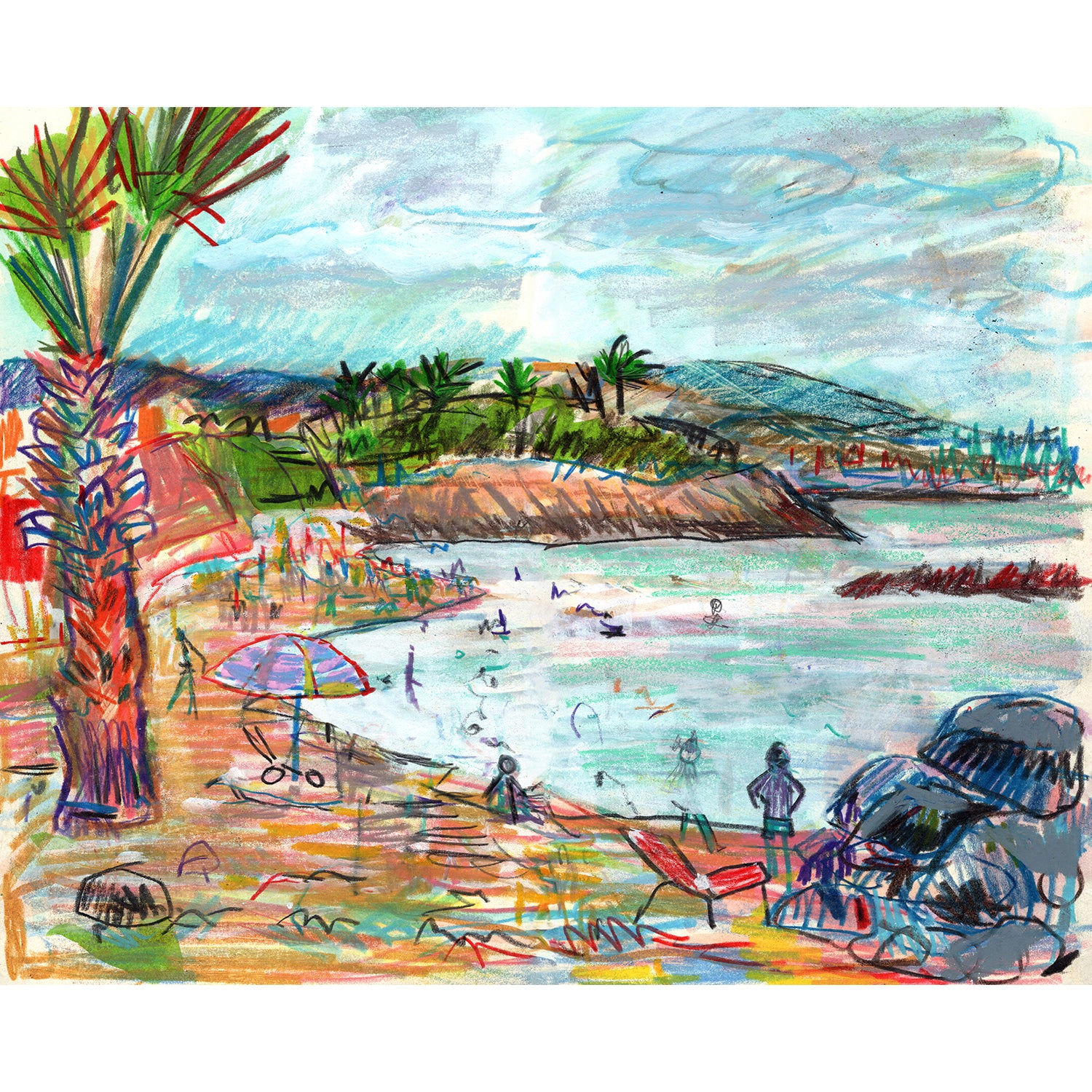 This little beach was a total delight. I really enjoyed visiting most days, either to draw the people, draw the beach or just to read and swim in the sea. I managed to do this drawing one morning before it got too hot.