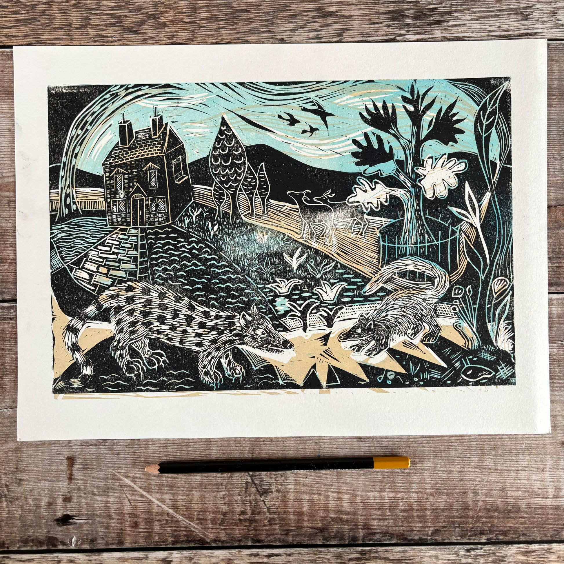 My artwork is handprinted with love from my colourful studio in the heart of rural England and shipped to customers worldwide.