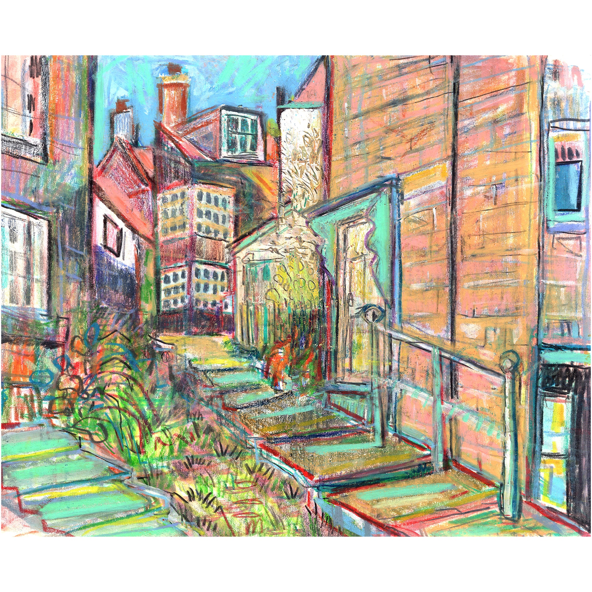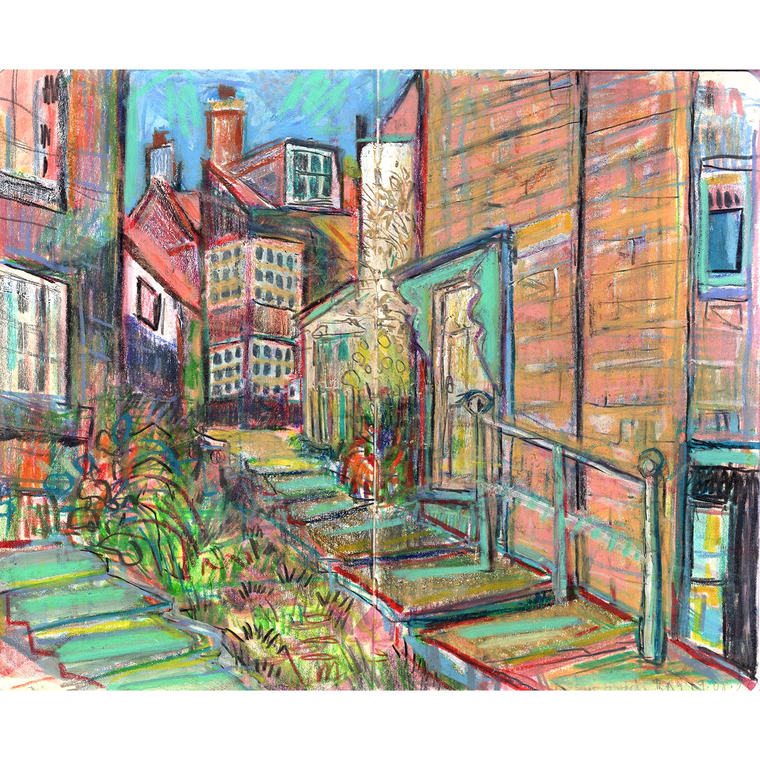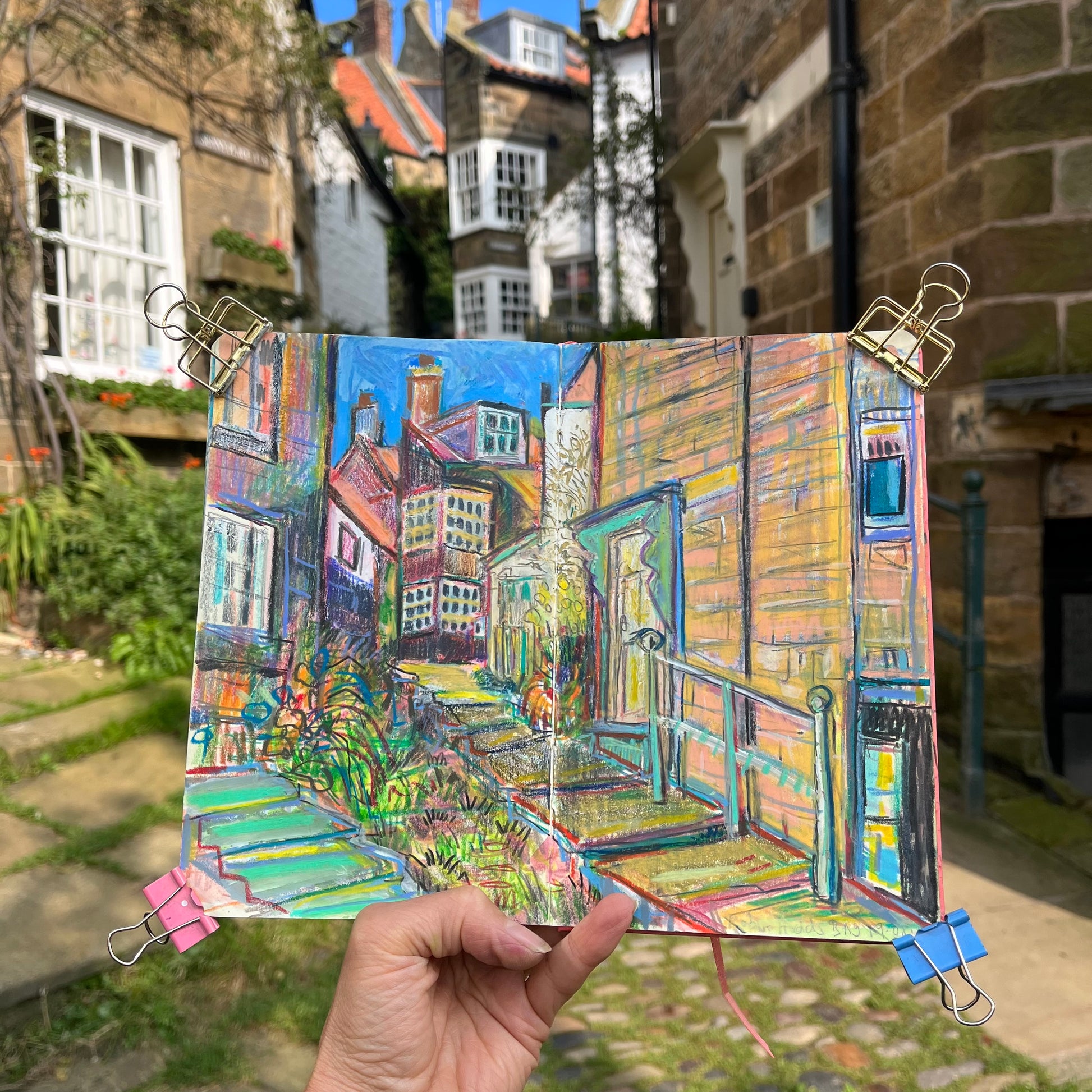 In August 2023, Marple and I took Sylvie the camper van on an adventure around Yorkshire. We spent a lovely day exploring Robin Hood’s Bay, wandering through its narrow streets and winding alleys. After a quiet morning drawing on the beach, I stumbled across this tucked-away spot - something about it felt completely magical. I set up my stool and spent the afternoon drawing. A woman staying in one of the nearby cottages noticed me sketching and kindly brought out a cool drink for me and biscuits for Marple. A small gesture, but one that made the whole afternoon feel even more special.