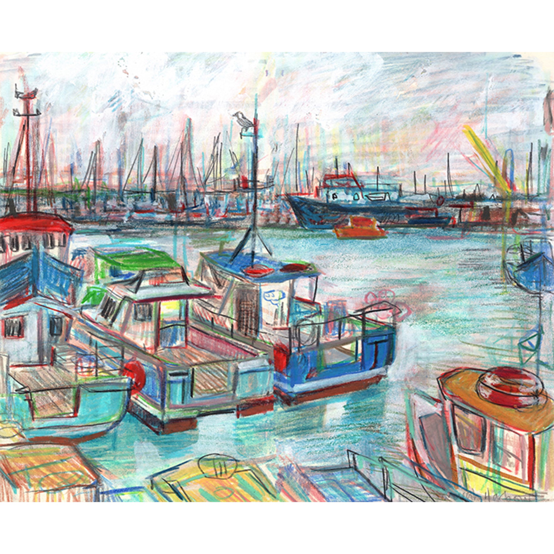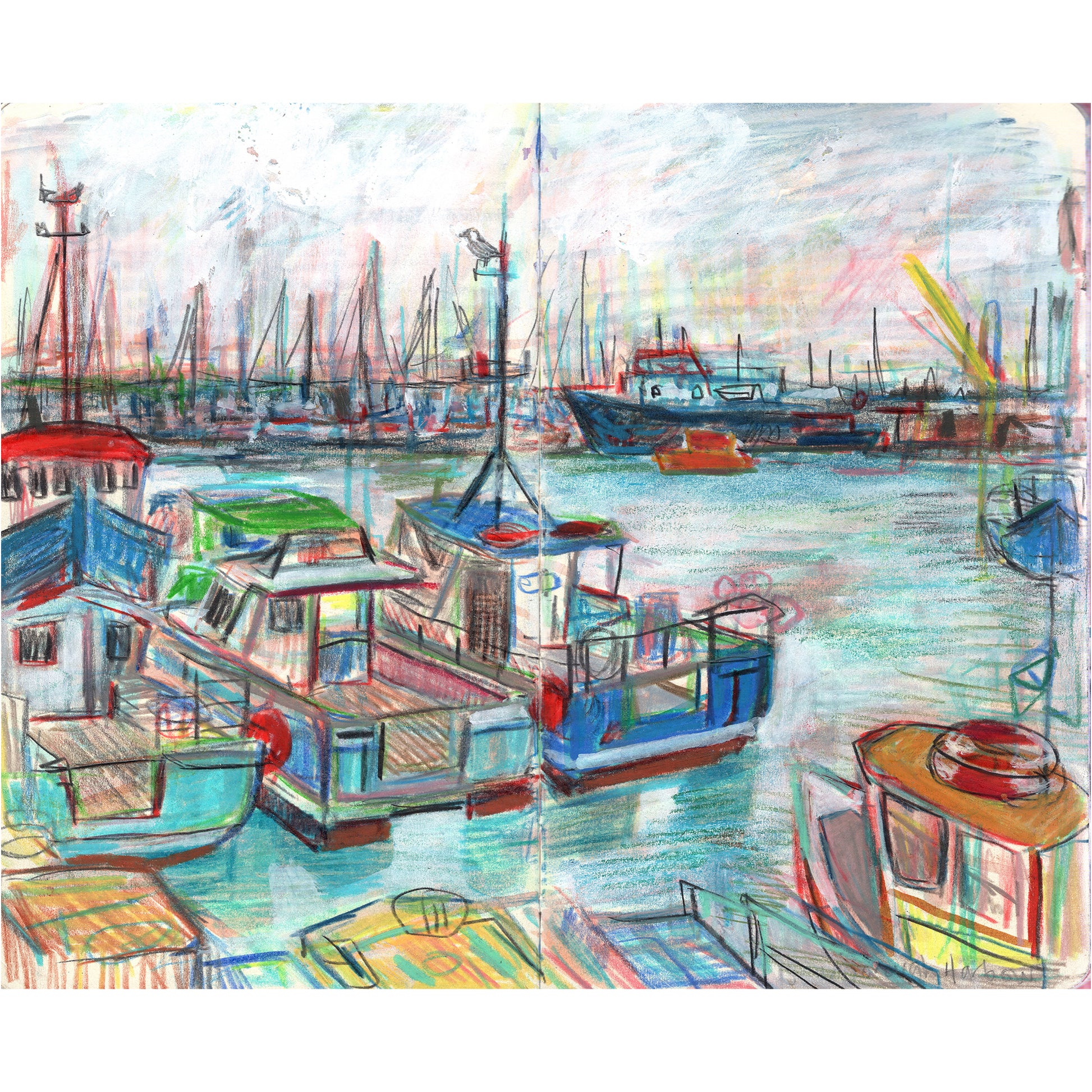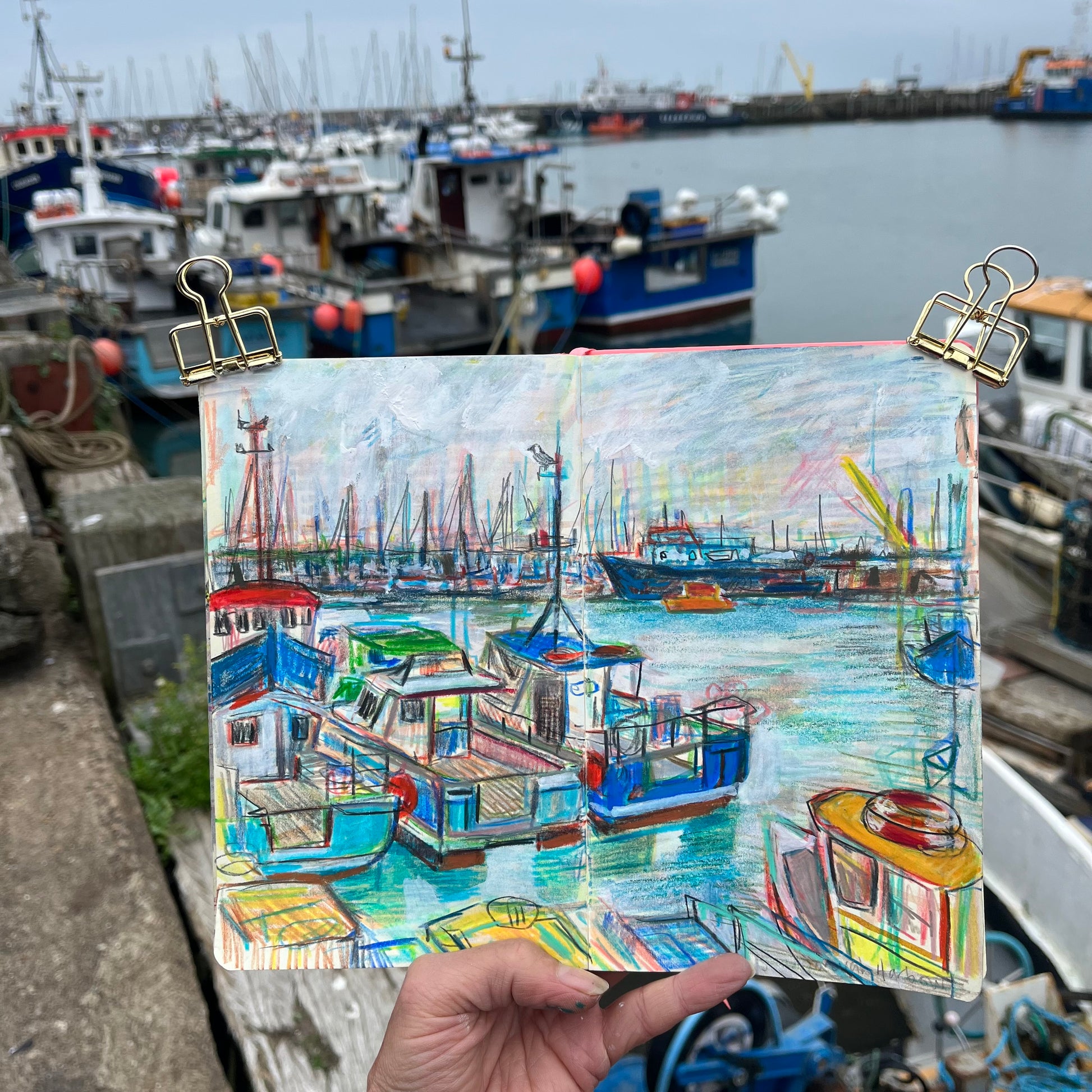 It was a cool, grey and misty day when we visited Scarborough - actually my favourite kind of weather for drawing. The light was soft and even, and the colours felt beautifully muted. I spent the morning sketching on the beach, then moved to the harbour for the afternoon. I remember tucking myself away, wrapped up warm, just quietly observing the boats. This drawing ended up being one of my favourites from the whole Yorkshire trip.