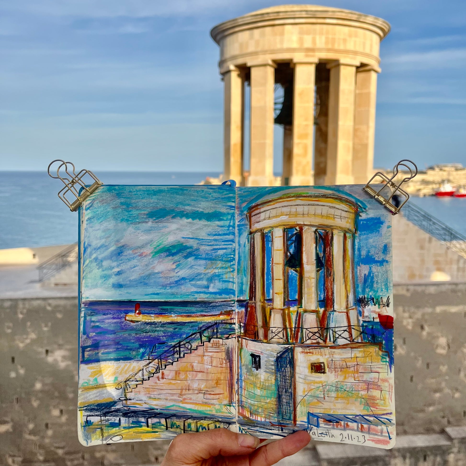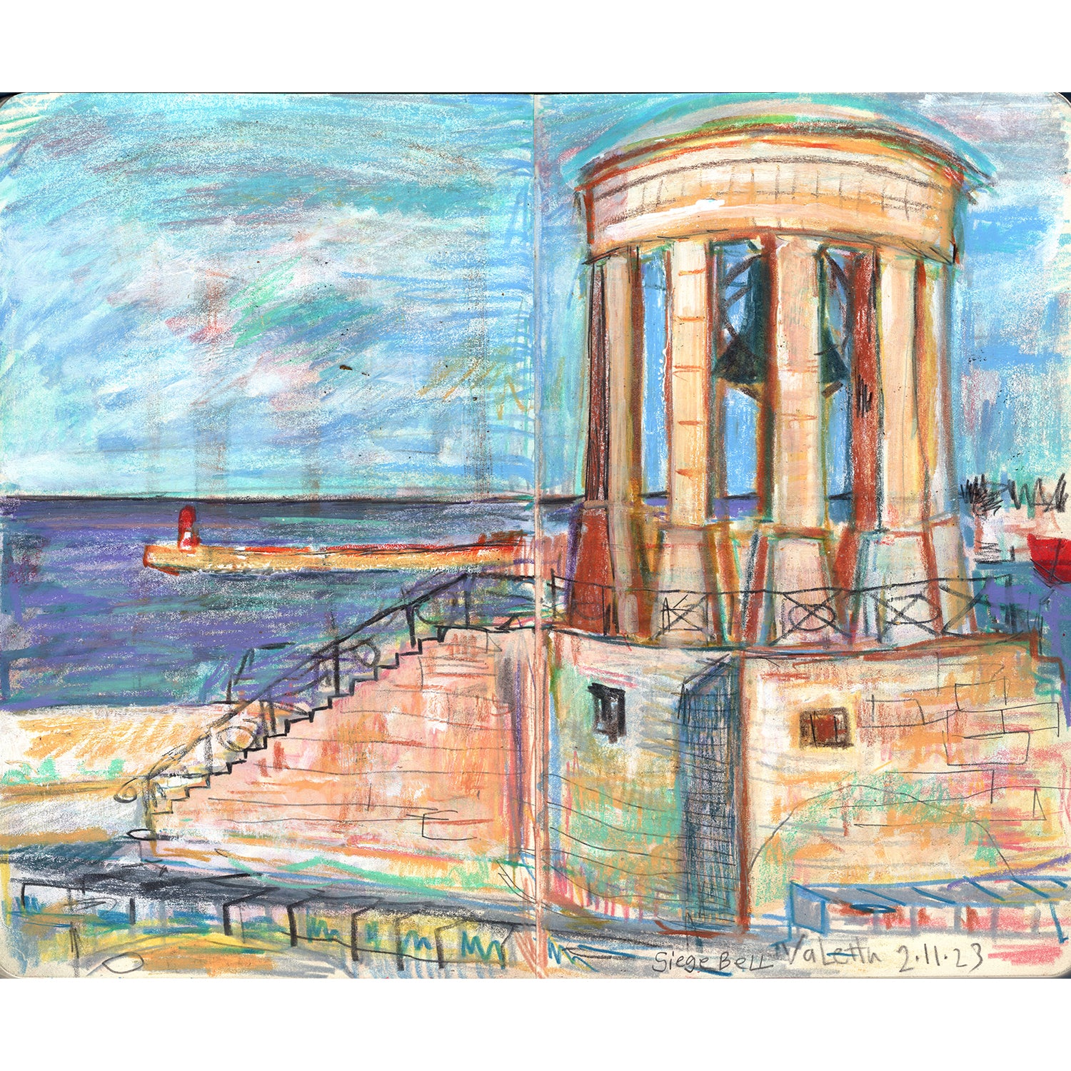 I came across the Siege Bell whilst I was wandering around Lower Barrakka gardens. I was immediately struck by the simplicity of the structure that housed such a large, impressive bell.it was built in 1992 to commemorate the 50th anniversary of when Malta received the George Cross for the display of bravery and valour shown during the attacks on the island from 1940-42. I found a shady spot and enjoyed my afternoon drawing the bell and the surrounding harbour.