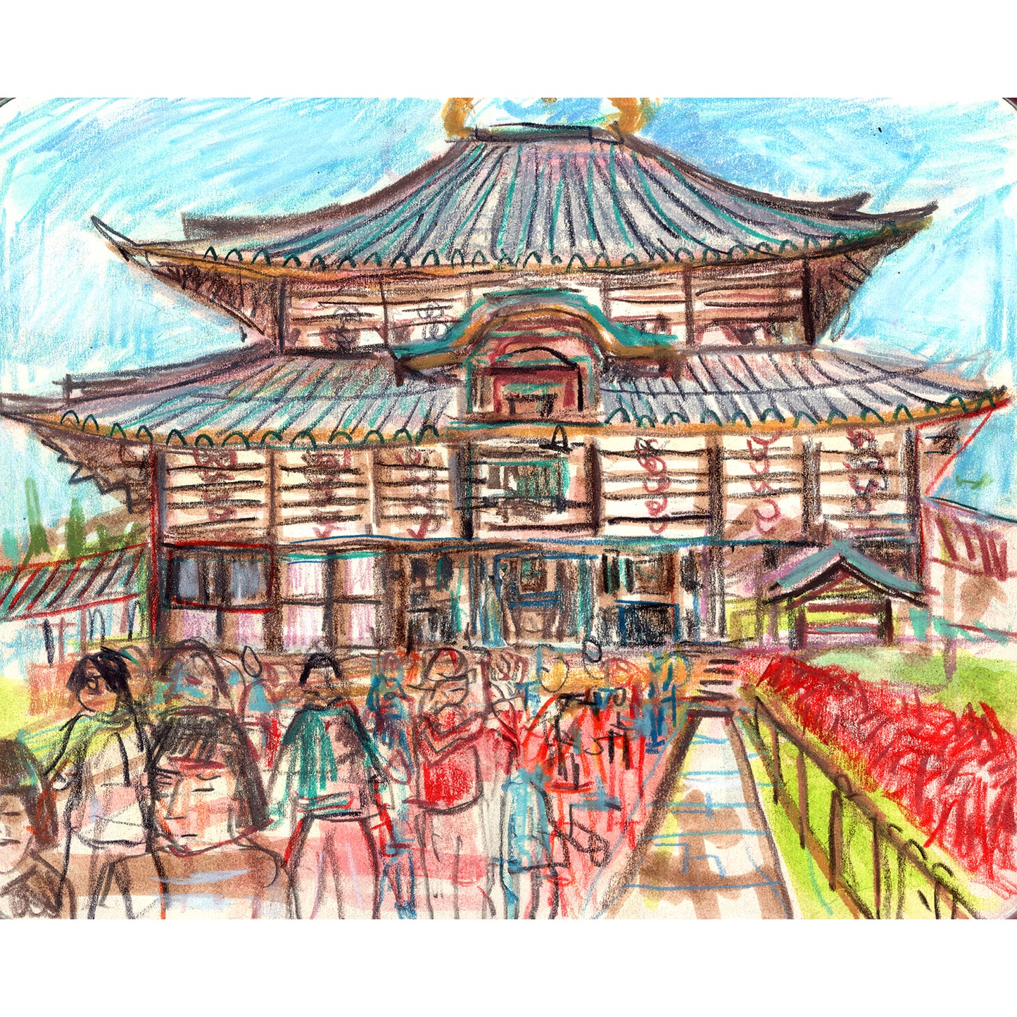 I didn't make it to Nara on my first visit to Japan, so this time it was on my list. I took a day trip there from Osaka and had the most wonderful time. This is a drawing of Todaiji, the main temple. It was so busy when I visited, however, I managed to find a quiet spot tucked away in the corner to do this drawing. I was working for over an hour when I looked up behind me to see I had a audience of people watching me draw!