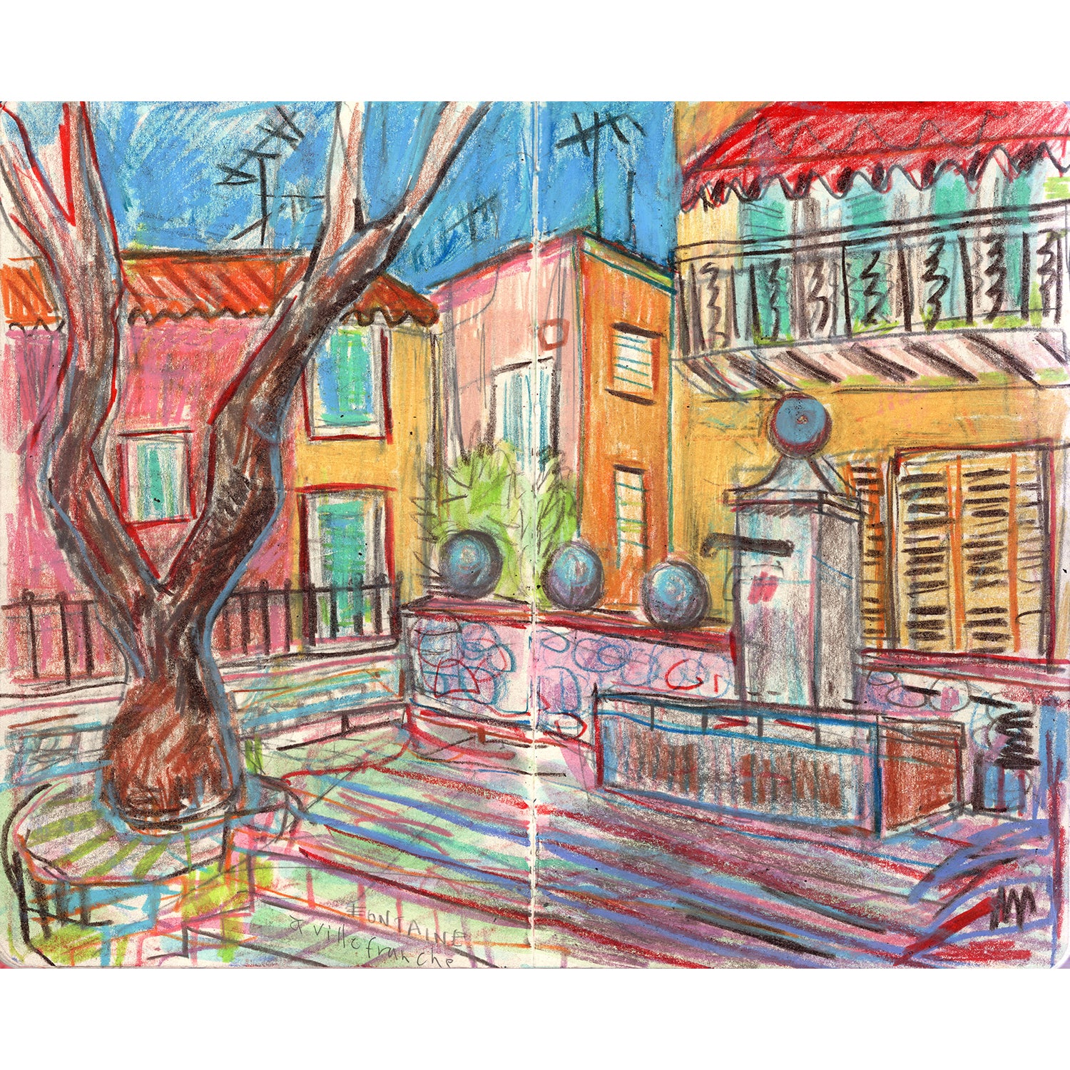 I love Villefrance Sur Mer - I love the old town with it's small alleyways and quaint streets. Last year I stumbled across this square - Place Felix Poullan to find a replica of painting that the artist Armand Ingenbleek painted of the same square in 1927. ( see photo 3 ) I loved the fact that the buildings remained unchanged and that the tree was still there. It seemed the perfect place to sit and draw for a few hours.