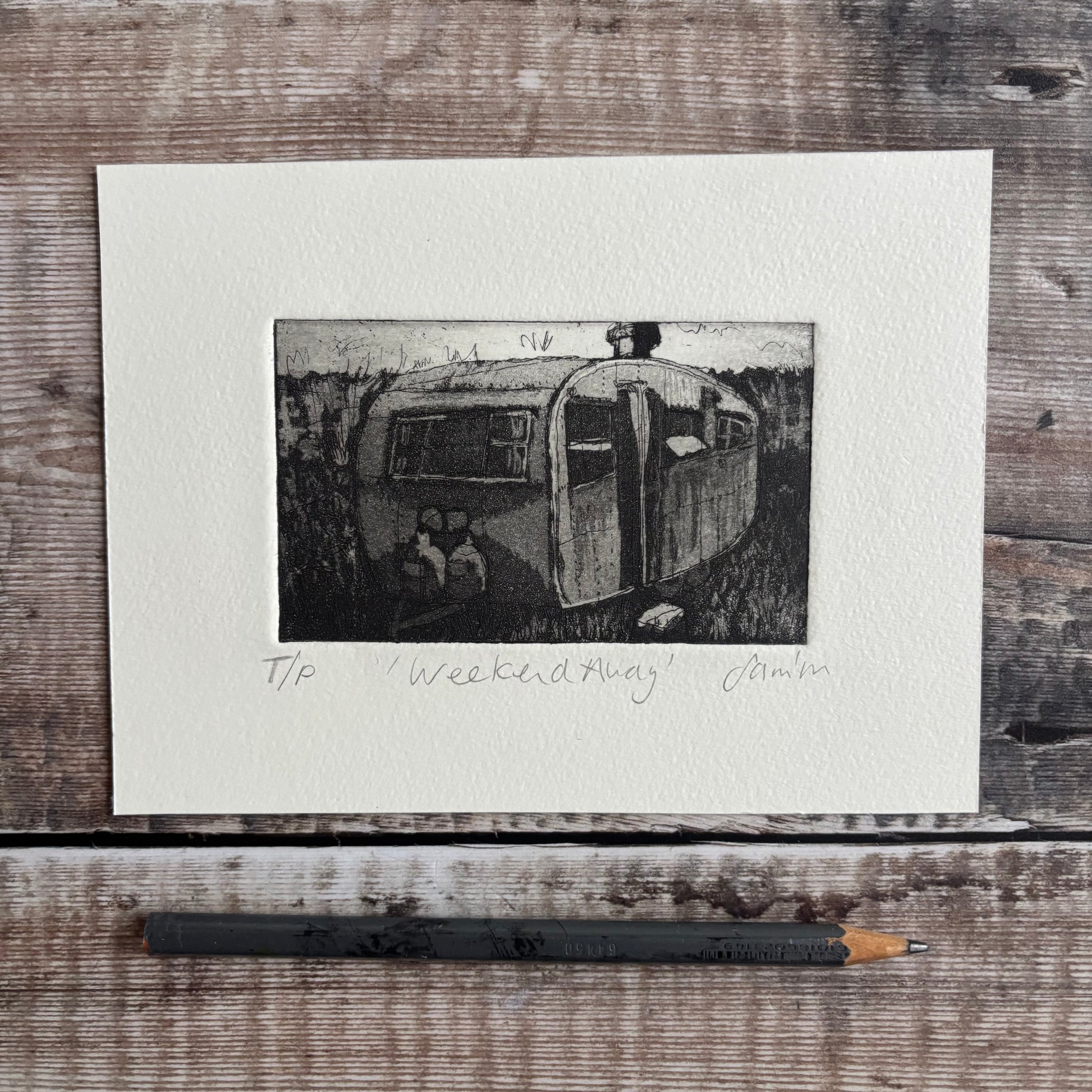I have one of my now sold out ‘Weekend Away’ air stream caravan etchings available.