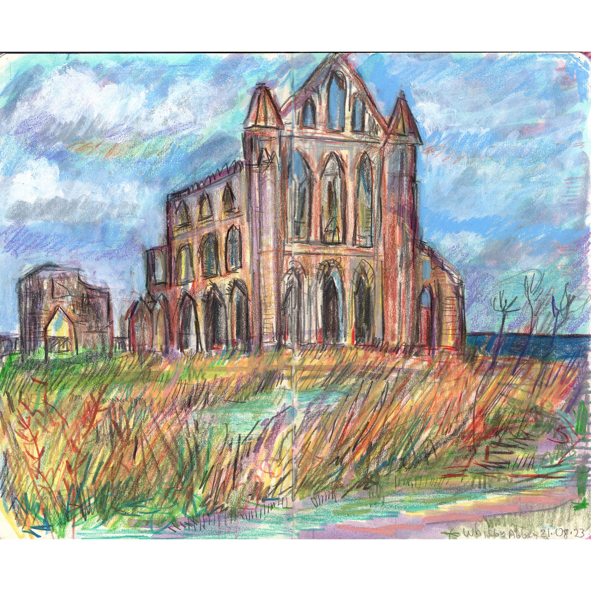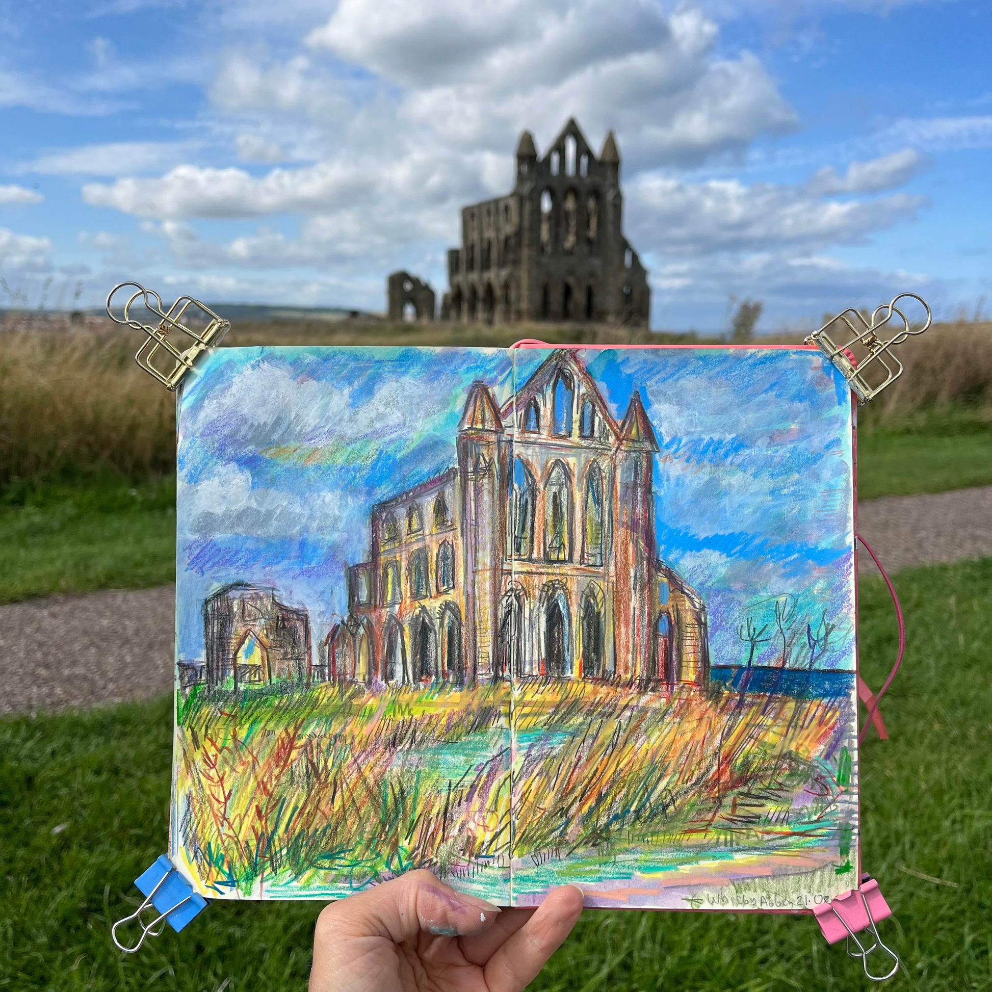 In August 2023, Marple and I took Sylvie the camper van on an adventure around Yorkshire. We spent a hot summer’s day in Whitby and climbed up to the Abbey in the morning before it got too busy. I sat and sketched while Marple found some shade and snoozed. The Abbey is full of atmosphere and grandeur, perched high above the sea. Drawing it was one of the real highlights of the trip.